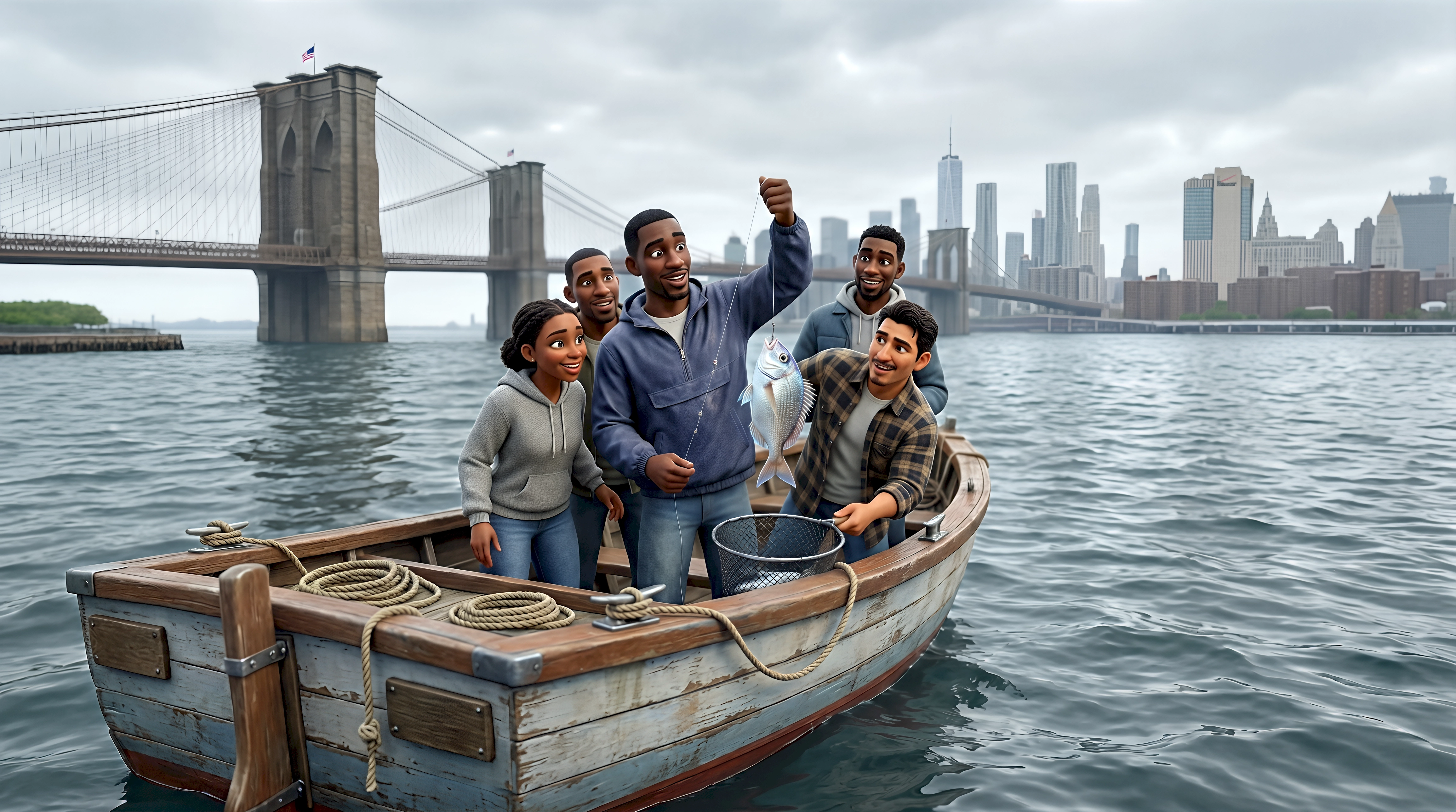 Four CGI animated 3D characters — a Black woman with braided hair in a grey hoodie and jeans, a tall Black man in a navy half-zip pullover and jeans triumphantly holding up a freshly caught silver fish, a second Black man in a grey hoodie grinning beside him, and a Latino man in a brown plaid flannel shirt reaching up with a landing net — celebrate a catch from a weathered wooden rowboat on the East River with the Brooklyn Bridge and Lower Manhattan skyline including One World Trade Center visible under an overcast sky in New York City, part of HubPlanet's virtual NYC city life simulation 4K render.