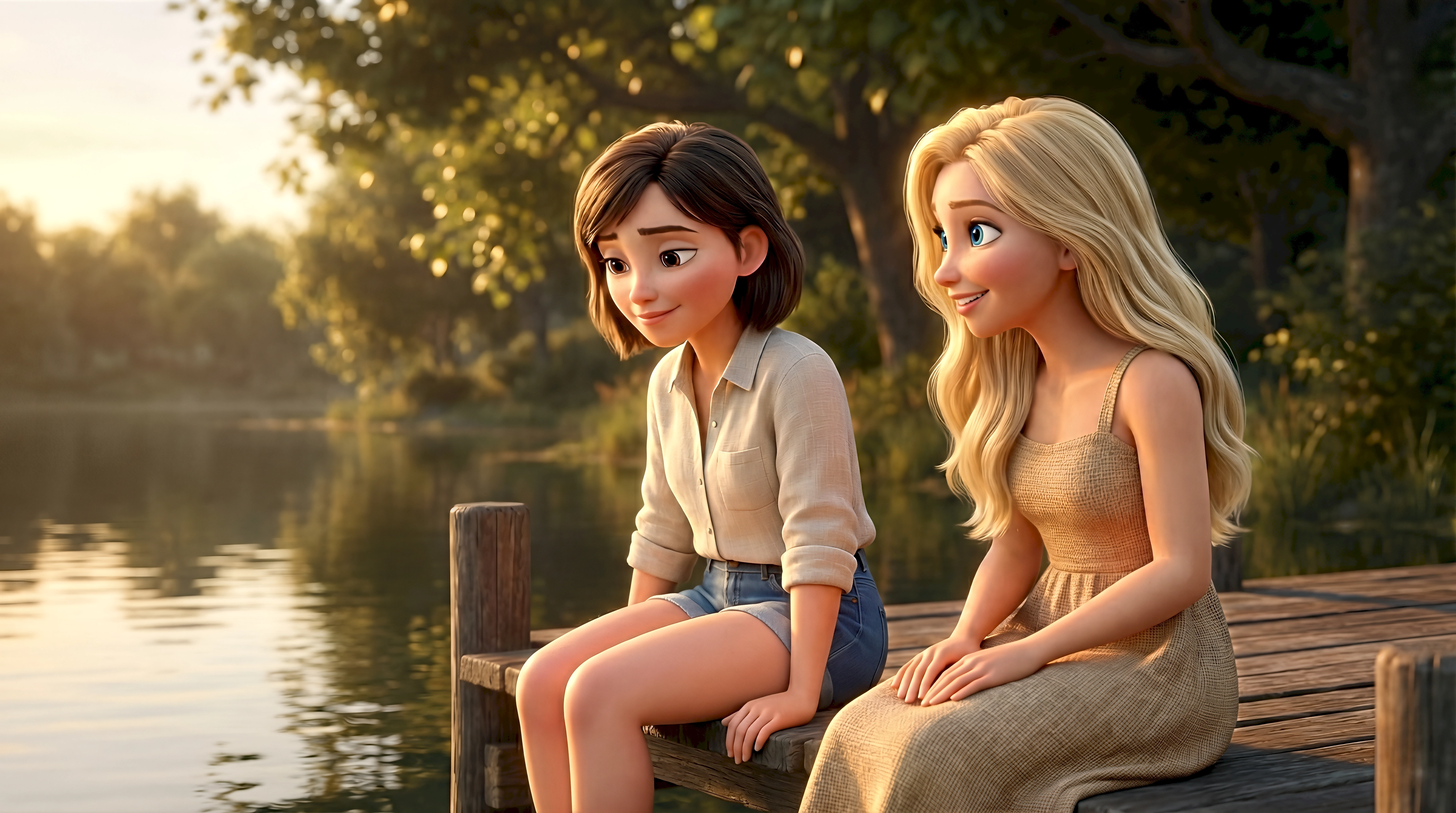 Two stylized cinematic 3D characters — a white girl with a short dark brown bob in a cream linen button-up shirt with rolled sleeves and denim cut-off shorts, and a white woman with long flowing blonde hair and blue eyes in a tan woven sundress — sit side by side on a weathered wooden dock sharing a peaceful moment overlooking a glassy lake surrounded by lush summer deciduous trees at golden hour in New York's Finger Lakes region, part of HubPlanet's immersive digital city 4K render.