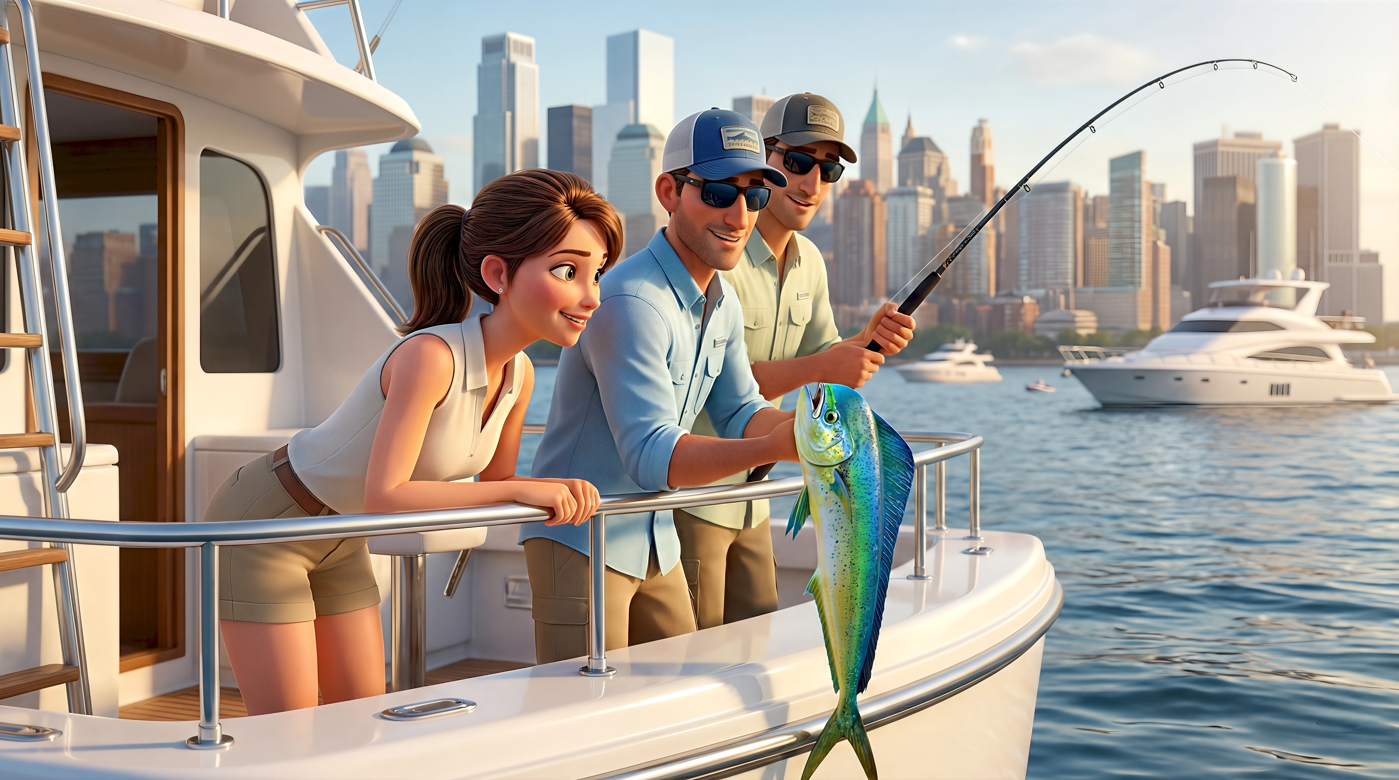 Three stylized realism 3D characters — a white woman with a brown ponytail in a cream sleeveless top and tan shorts leaning on the chrome rail, a white man in a light blue fishing shirt, blue sunglasses and a blue trucker cap lifting a vivid green and blue mahi-mahi on a heavy rod, and a white man in a sage green fishing shirt, grey sunglasses and a grey trucker cap grinning behind him — fish from the stern of a premium white luxury motor yacht on New York Harbor with the Midtown Manhattan skyline gleaming across the water under clear blue skies, part of HubPlanet's cinematic open world platform 4K render.