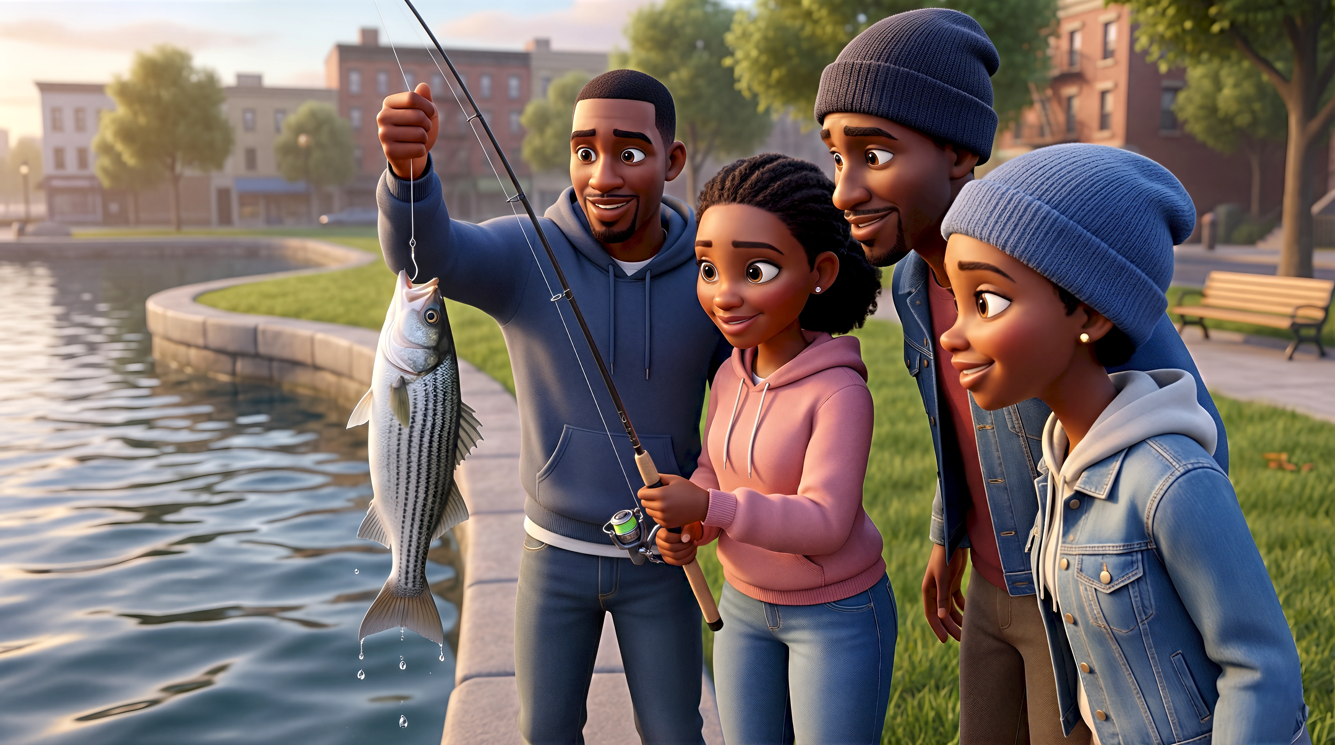 Four expressive 3D animated characters — a Black man in a grey hoodie and jeans hoisting a striped bass on the line, a Black teenage girl in a pink hoodie and jeans gripping the spinning rod, a Black man in a pink shirt and navy knit beanie leaning in with excitement, and a Black young woman in a denim jacket over a white hoodie and blue slouch beanie looking on in amazement — celebrate a catch along a curved stone seawall waterfront park in the Bronx's Pelham Bay Park, New York City, part of HubPlanet's immersive digital city 4K render.