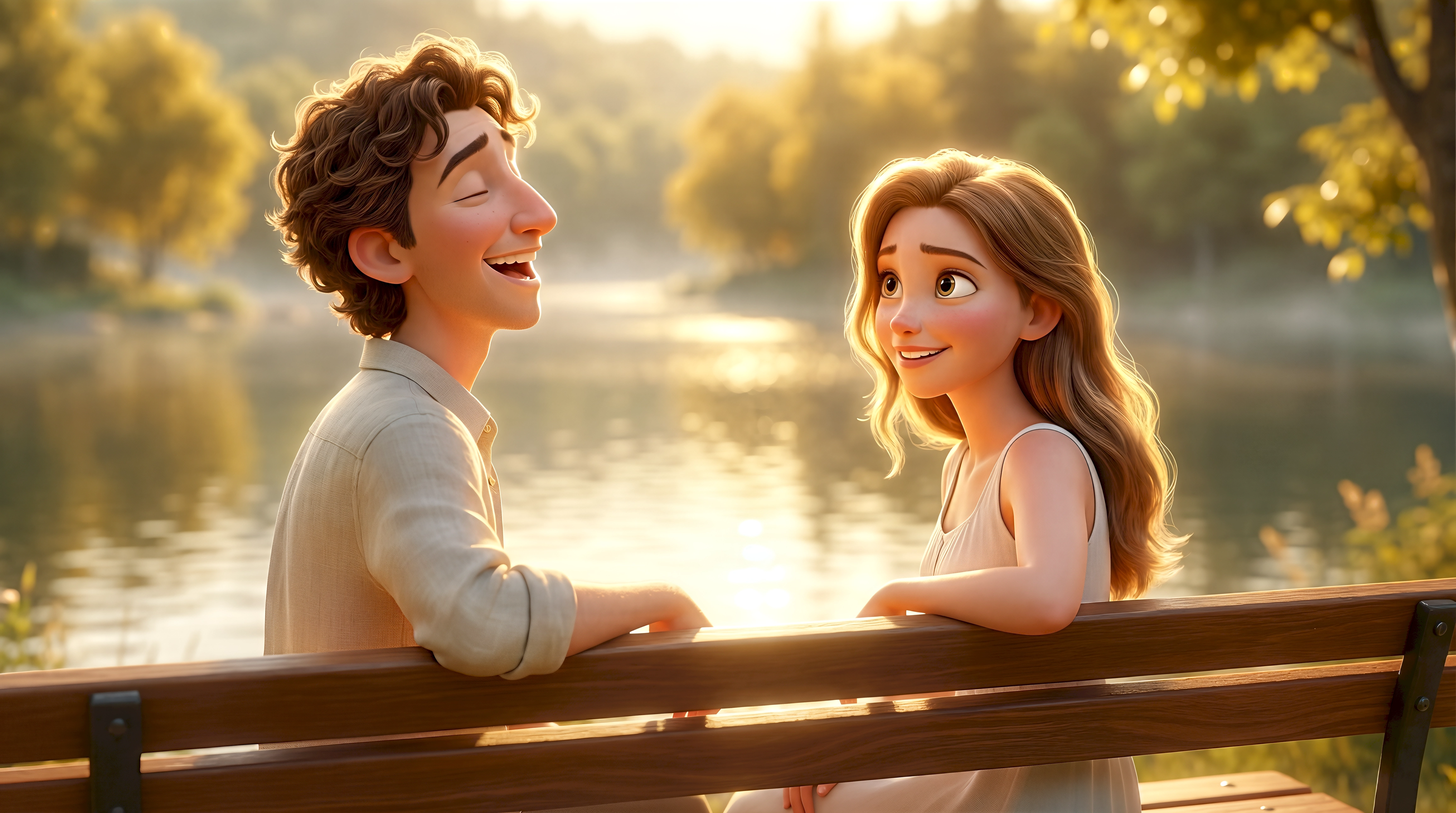Two stylized realism animated characters — a white man with curly brown hair in a cream linen shirt laughing joyfully with eyes closed and a white woman with long wavy light brown hair in a white sundress gazing at him warmly — share a tender moment on a wooden park bench beside a sunlit glassy lake surrounded by golden tree canopy in Central Park New York, part of HubPlanet's immersive digital city 4K render.