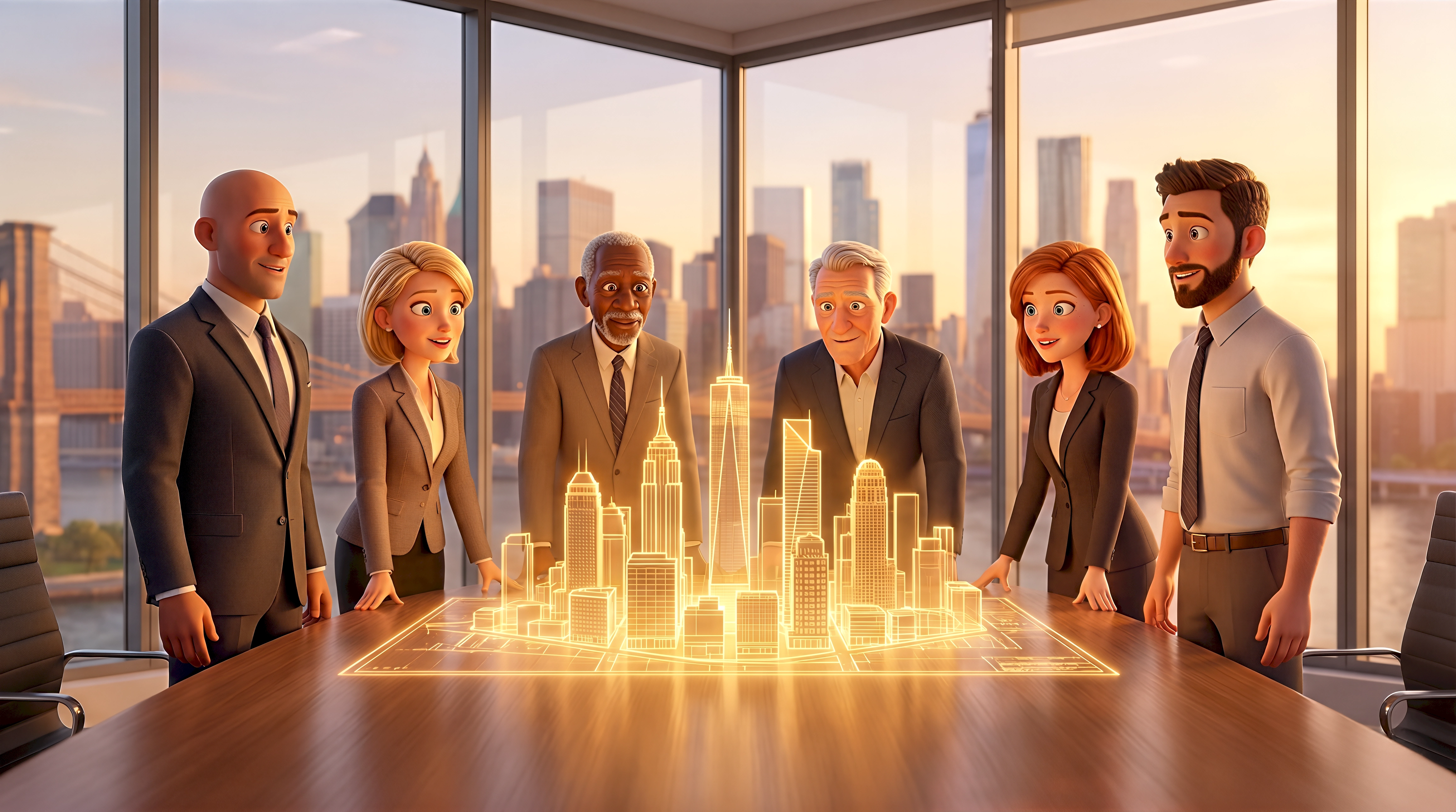 Five cinematic 3D animated characters — a diverse group of business professionals in suits and blazers including a Black elder statesman and mixed-age colleagues — lean over a boardroom table in awe of a glowing holographic Manhattan skyline projection in a glass corner office overlooking the Brooklyn Bridge and Lower Manhattan at golden hour in Dumbo New York, part of HubPlanet's photorealistic digital New York world 4K render.