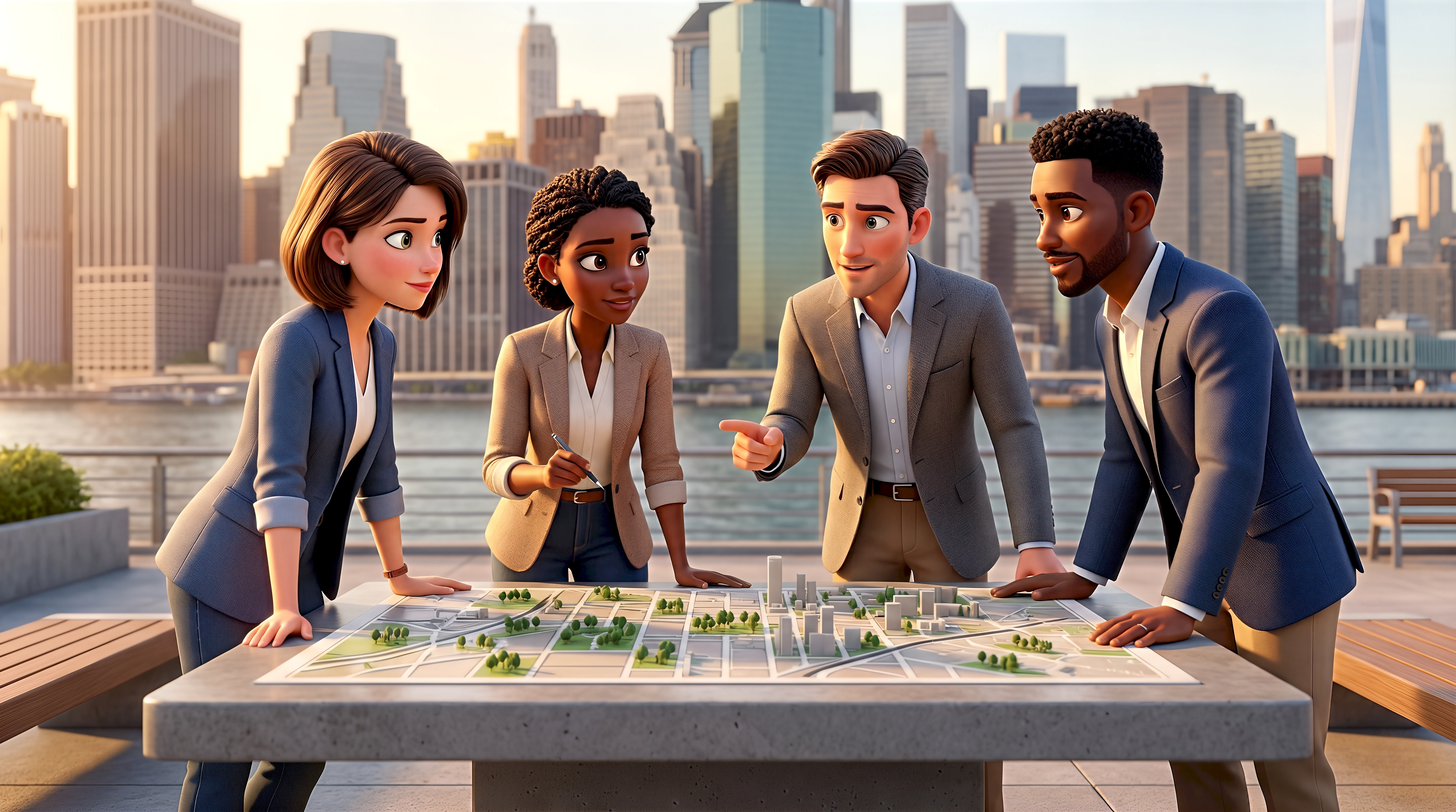 Dumbo brooklyn waterfront city planning scale model new york digital twin 3d architecture cinematic 3d characters hubplanet 4k.