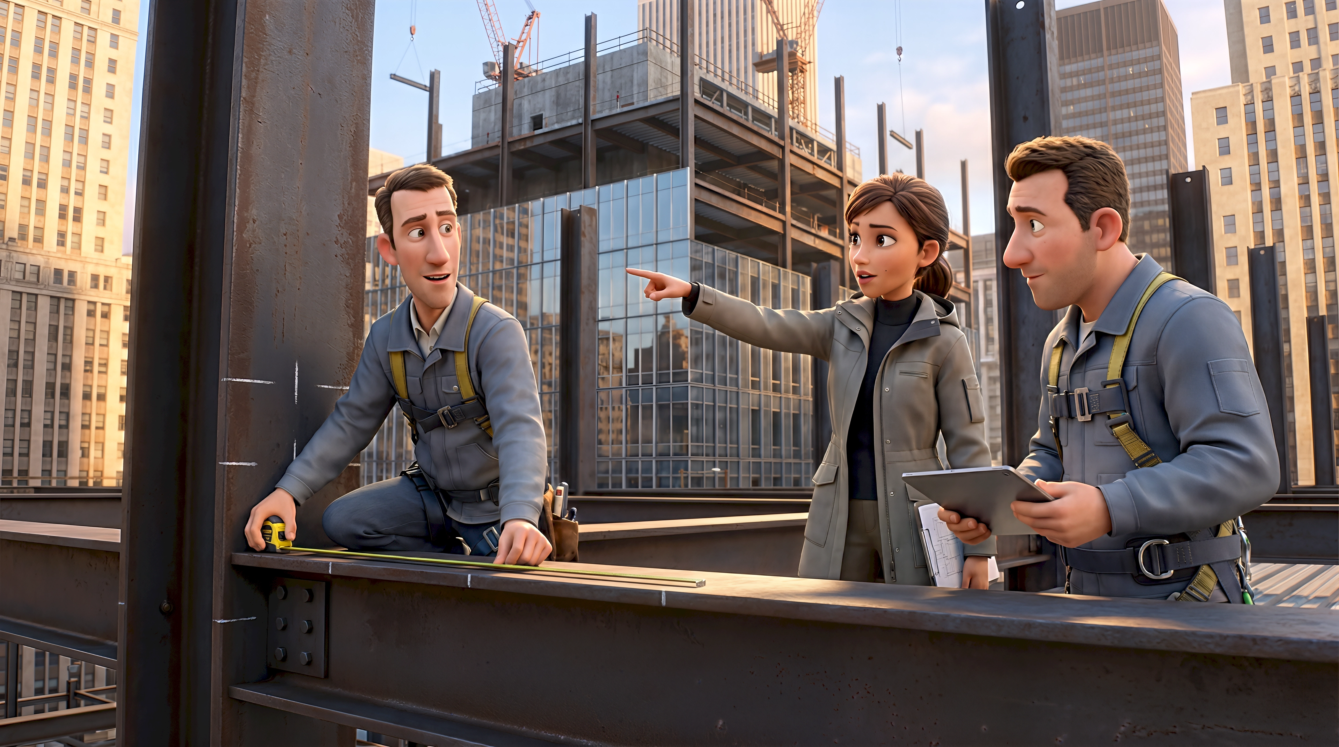 Three charming high-fidelity 3D animated characters — a white female architect in a grey trench coat pointing at structural details, a white male worker crouching on a steel beam with a measuring tape, and a white male engineer holding blueprints and a tablet — collaborate high above the Midtown Manhattan skyline on an active skyscraper construction site in New York, part of HubPlanet's Ultimate High-Fidelity Persistent Virtual World 4K render.