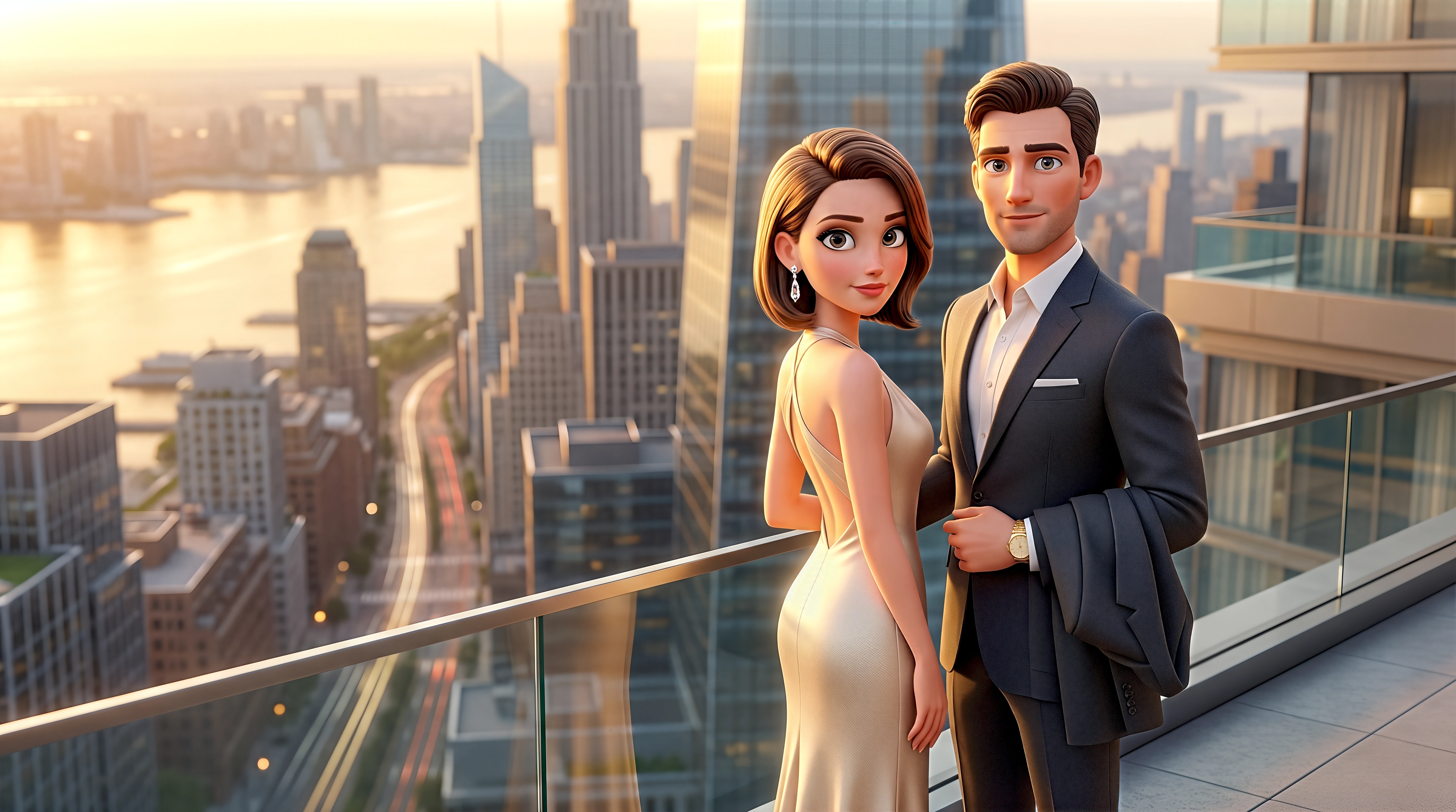 Two cinematic 3D animated characters — a white woman in a champagne silk bias-cut slip gown with diamond drop earrings and a white man in a bespoke charcoal suit with an open-collar shirt and gold luxury watch — stand together on a glass-railed penthouse terrace overlooking the Hudson River and Manhattan skyline with the Empire State Building glowing at golden hour in Hudson Yards New York, captured in HubPlanet's old money aesthetic digital experience 4K render.