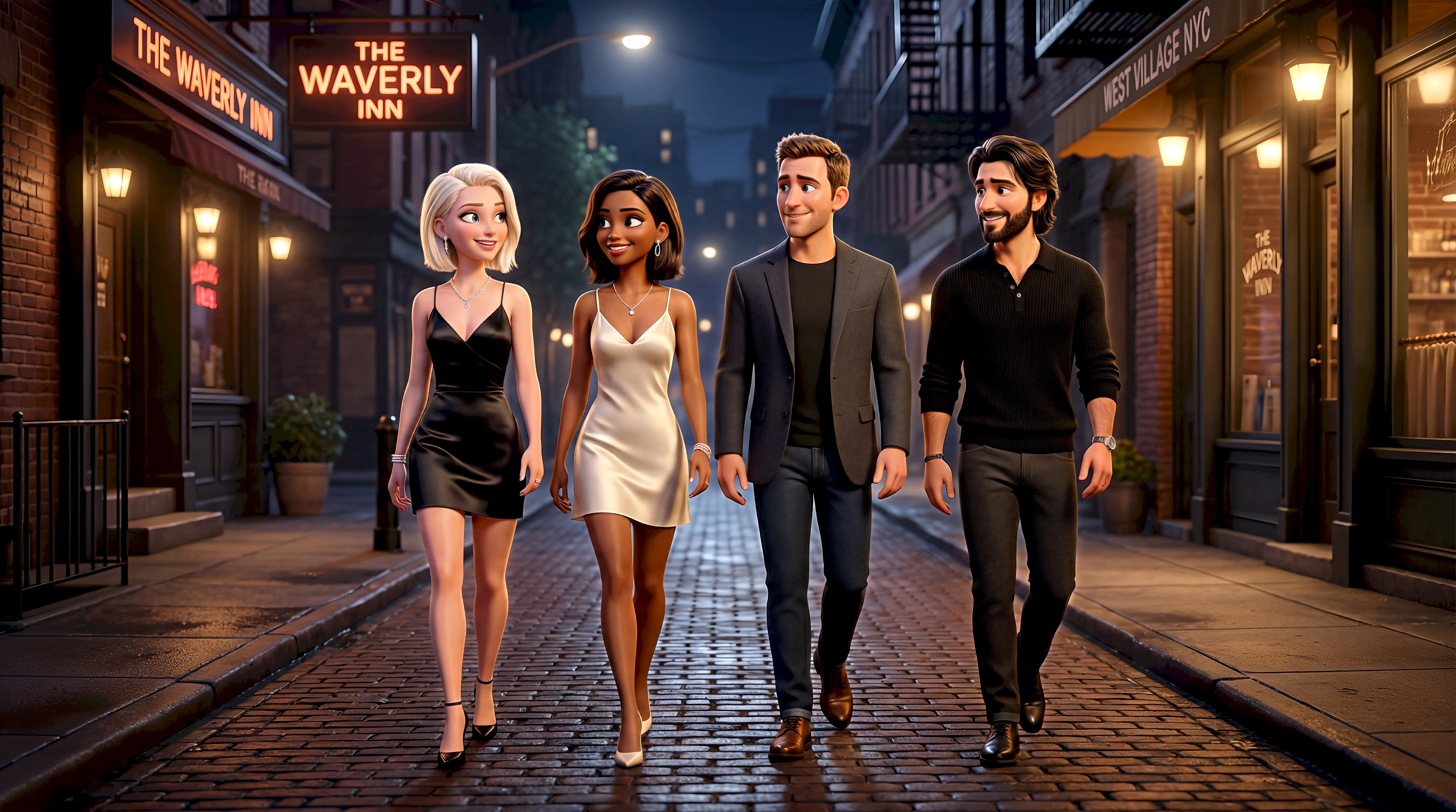 Four stylized 3D animated avatars in smart evening wear walk together down a cobblestone street past the glowing Waverly Inn sign in the West Village at night for premium 4K nightlife wallpaper.