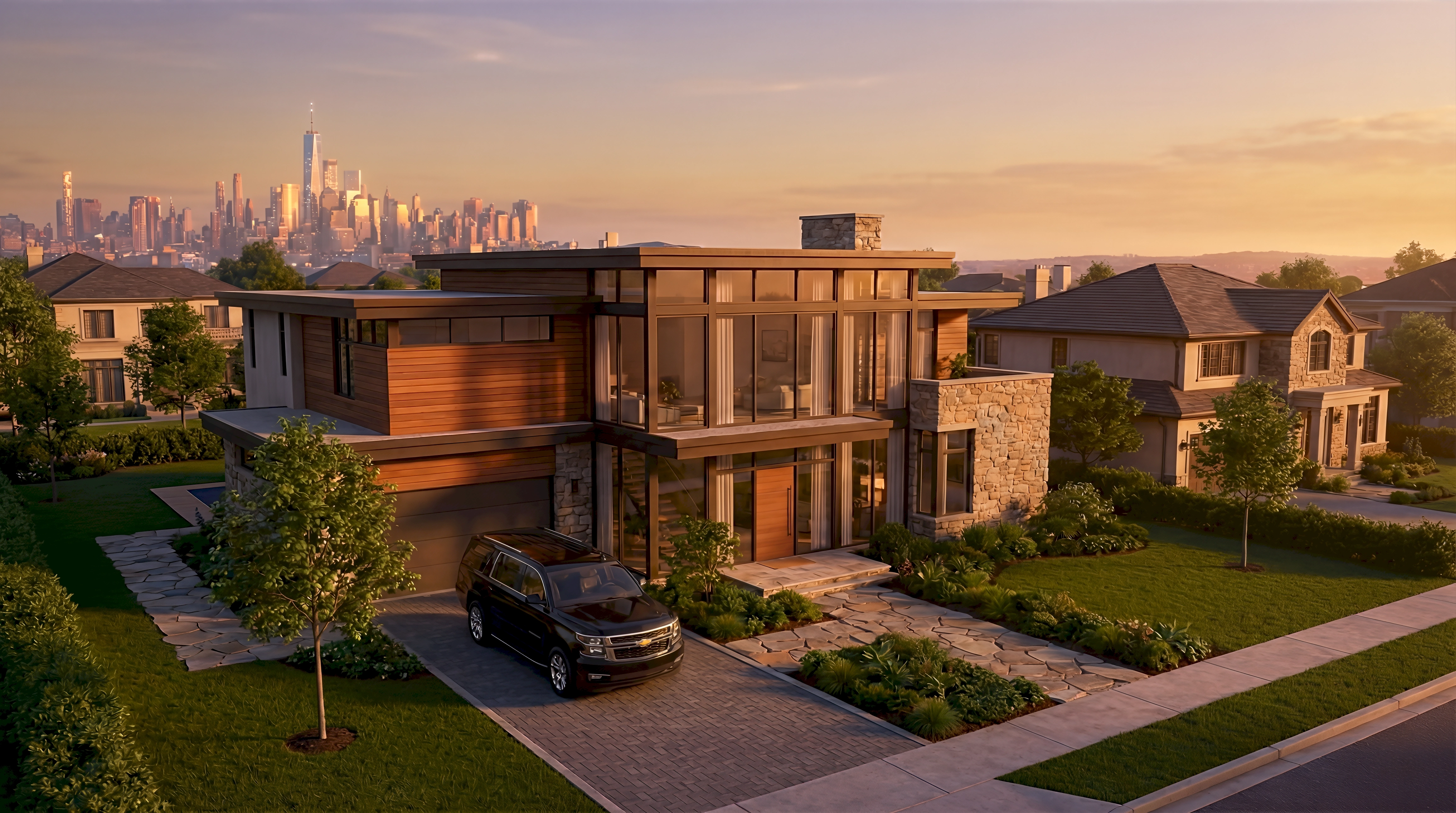 A 3D render of a contemporary prairie-style luxury home in Forest Hills New York featuring cedar horizontal cladding, stacked ledger stone, a clerestory glass curtain wall, cantilevered overhang with walnut pivot door, flagstone motor court with a black Chevrolet Tahoe, and a vivid glowing Manhattan skyline at golden hour dusk — a showcase of virtual estate living and digital architecture, part of HubPlanet's luxury real estate virtual NYC platform 4K render.