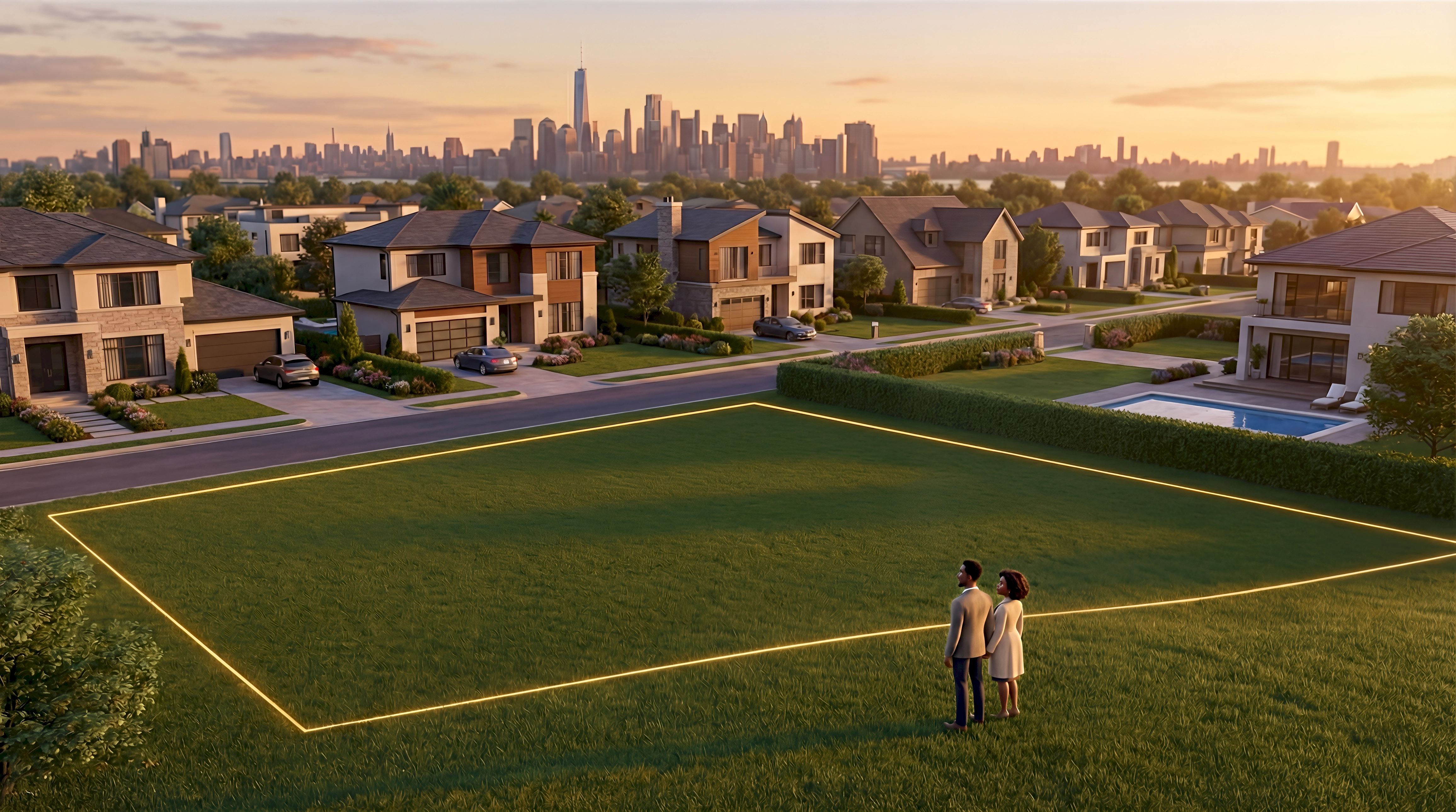 Two stylized 3D characters — a Black man in a tailored beige blazer and a Black woman in a cream dress with natural curly hair — stand at the edge of a glowing golden-outlined digital land parcel in Jamaica Estates New York, surveying their virtual plot across a luxury residential neighborhood of contemporary cedar-and-stone homes toward the full Manhattan skyline at golden hour, embodying land ownership and the future of virtual real estate, part of HubPlanet's digital twin real estate and virtual neighborhood experience 4K render.