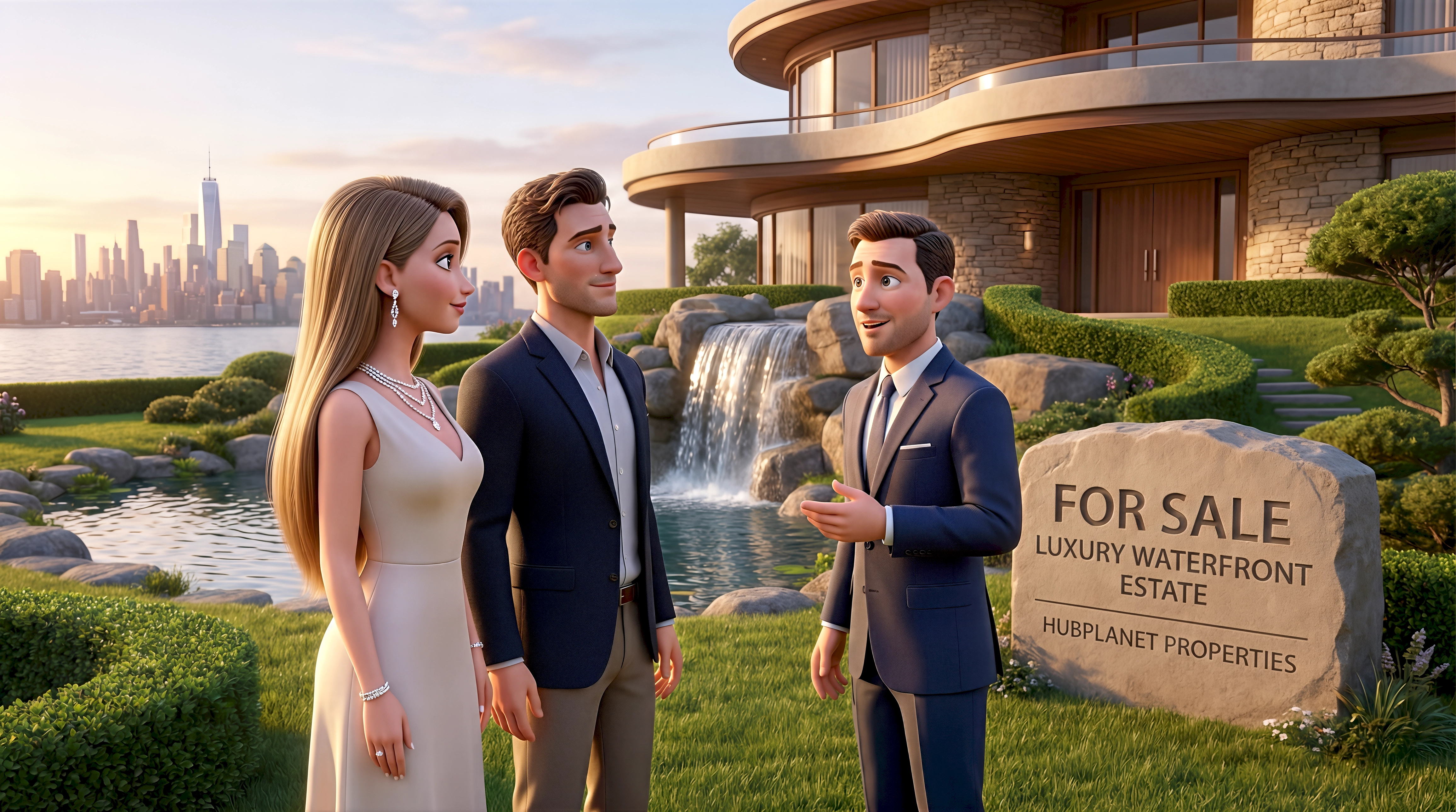 Three cinematic 3D CGI characters — a white woman in a champagne gown with diamond jewelry, her white male partner in a navy blazer, and a white male real estate agent in a fitted suit — gather beside an engraved 'For Sale — Luxury Waterfront Estate — HubPlanet Properties' boulder sign on the manicured grounds of a curved modernist waterfront estate in Jersey City New York, featuring a natural rock waterfall, Japanese cloud-pruned gardens, a cantilevered circular balcony, and the full Lower Manhattan skyline glowing across the water at golden hour, part of HubPlanet's luxury real estate virtual NYC platform 4K render.