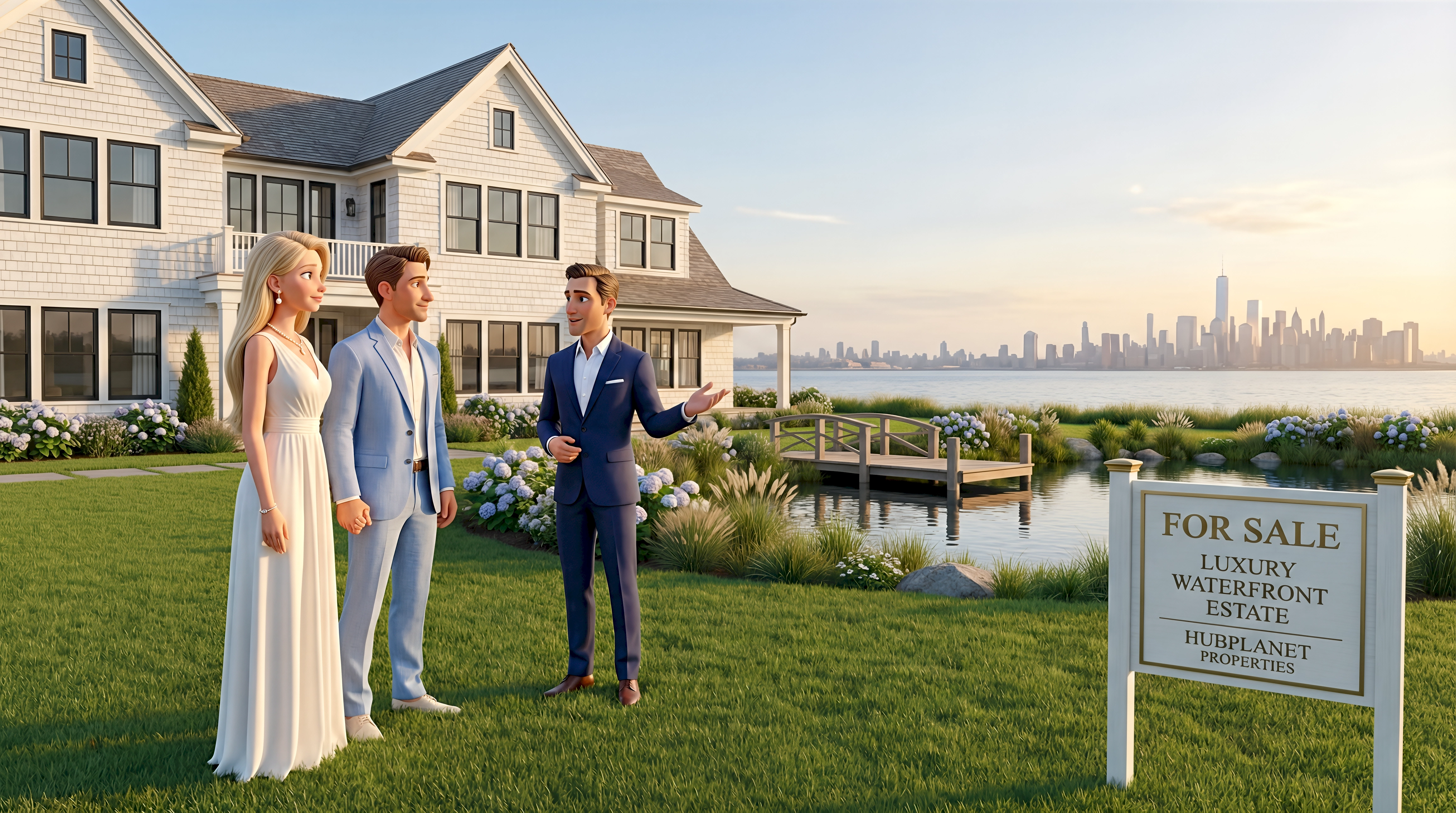 Three stylized 3D digital human characters — a white woman in a flowing white maxi dress, her white male partner in a light blue blazer and casual trousers, and a white male real estate agent in a navy suit — stand on the lawn of a classic Shingle Style waterfront estate in Kings Point New York beside a HubPlanet Properties for sale sign, with a natural pond, wooden dock bridge, hydrangea gardens, and the Manhattan skyline visible across Long Island Sound — showcasing waterfront property and virtual real estate ownership, part of HubPlanet's digital twin real estate and virtual neighborhood experience 4K render.