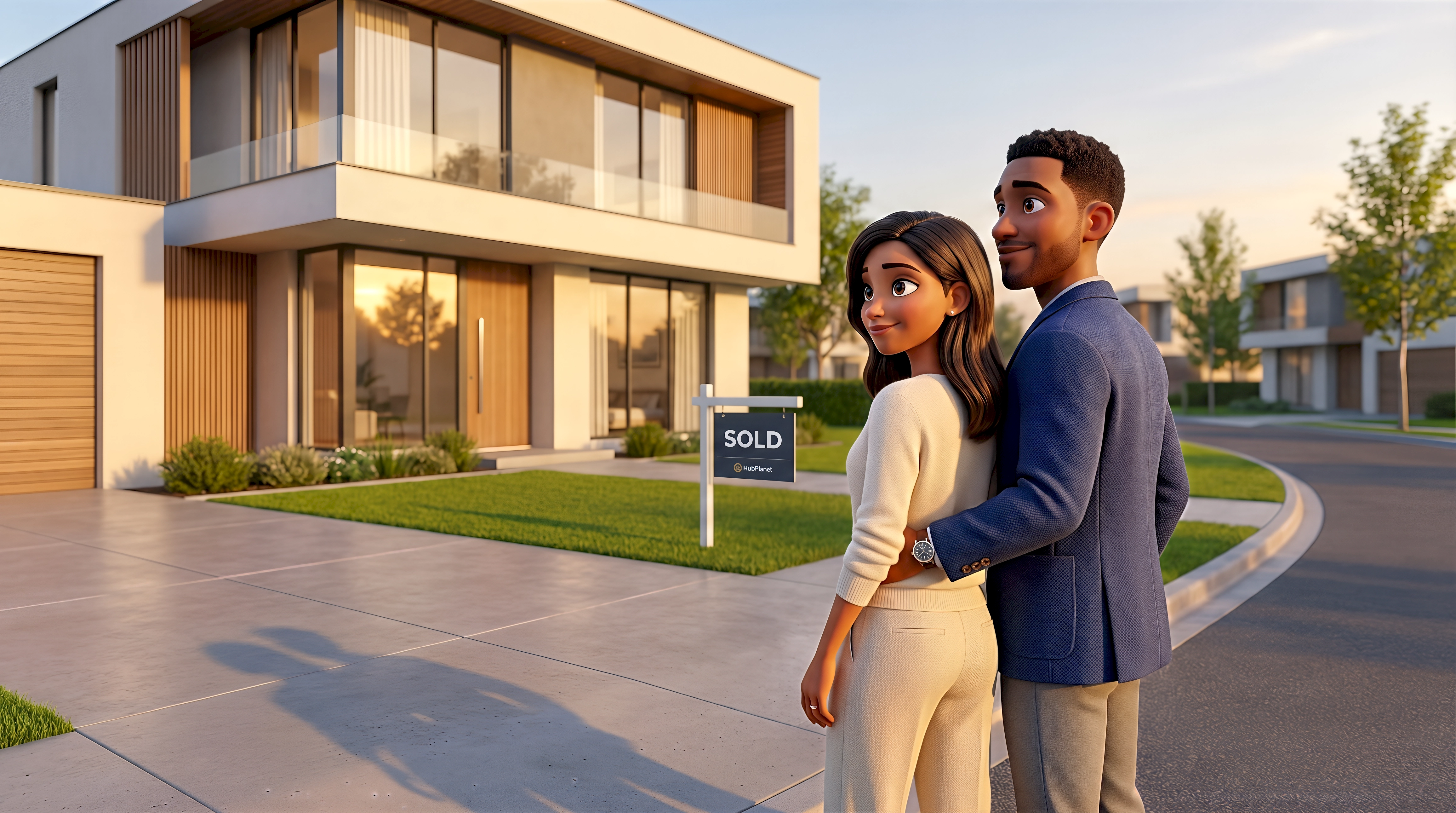 Two stylized 3D characters — a Hispanic woman in a cream knit sweater and tailored trousers and her Black male partner in a blue textured blazer — embrace on the driveway of their newly purchased contemporary home in Long Island City New York, a sleek two-story residence with white render facade, cedar wood screening, floor-to-ceiling glass sliding doors, and a manicured ornamental lawn beside a HubPlanet sold sign — celebrating virtual real estate ownership and digital home investment, part of HubPlanet's immersive NYC real estate virtual experience 4K render.