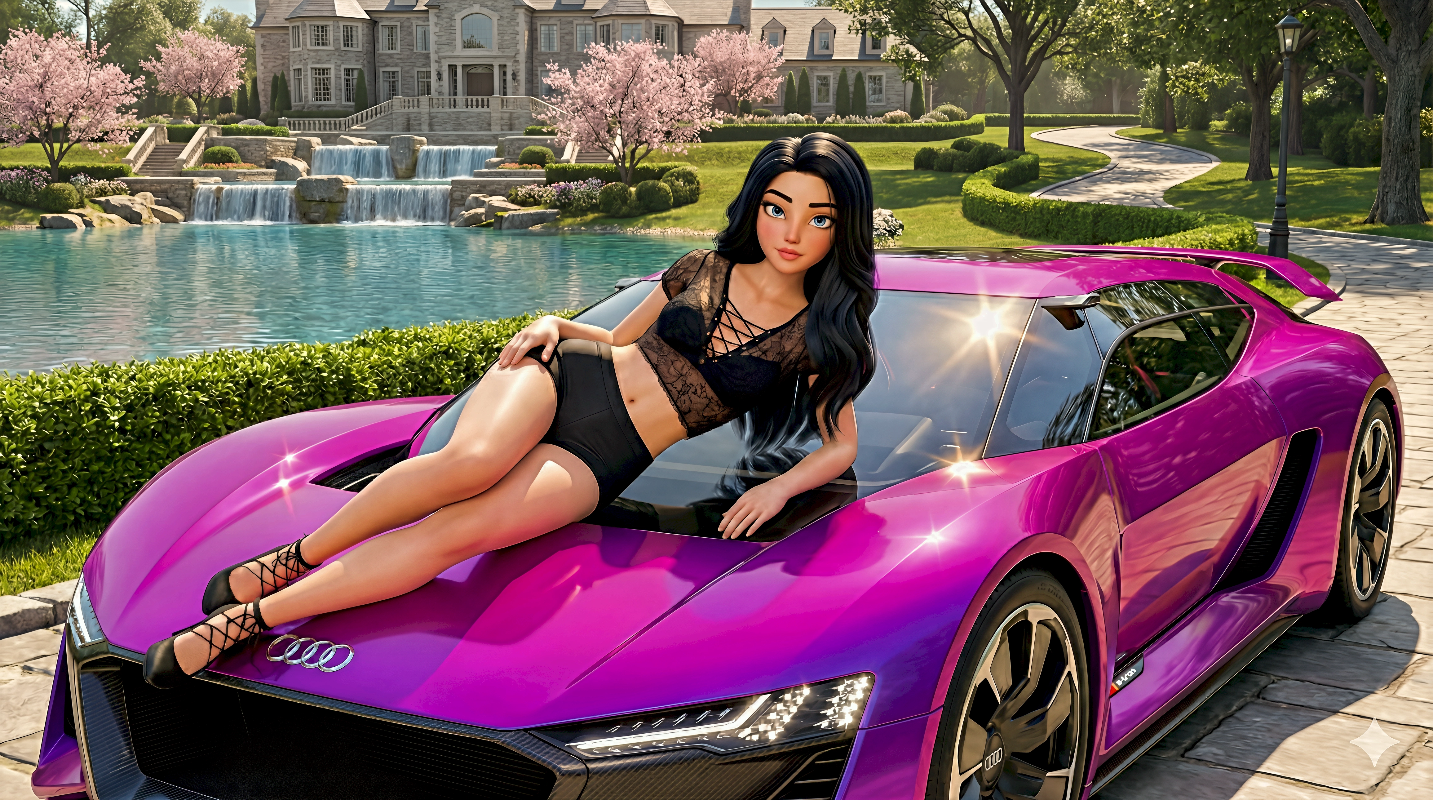 High-fidelity 3D magenta Audi PB18 e-tron electric mega car at a Lattingtown stone manor estate within the HubPlanet Digital Twin for premium 4K wallpaper.