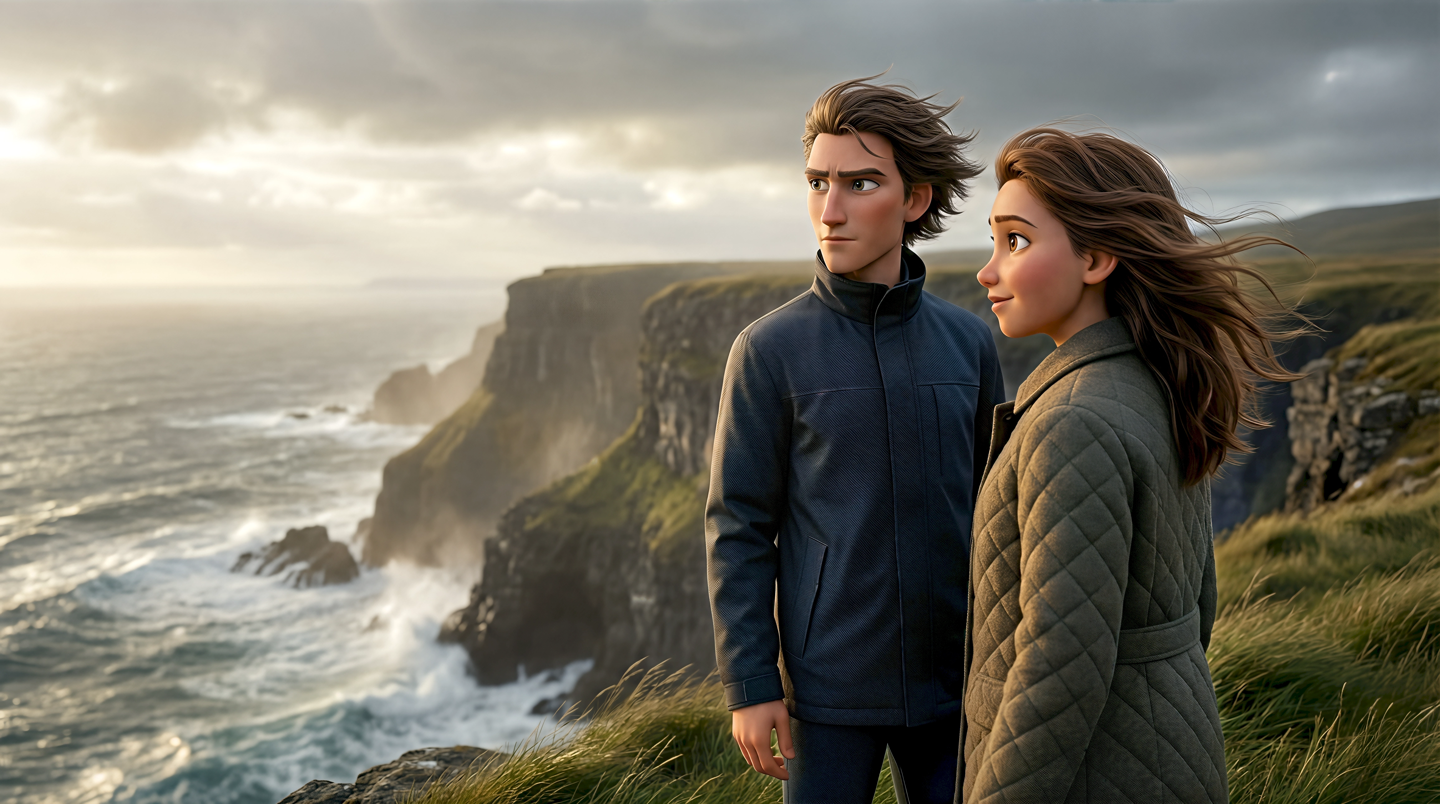 Two expressive 3D animated characters including a man in a dark zip jacket and a woman in an olive quilted coat stand windswept on the dramatic clifftop edge overlooking the crashing Atlantic at the Cliffs of Moher in Ireland with ancient stone ruins visible behind them, part of HubPlanet's virtual tour and digital tourism platform 4K render.