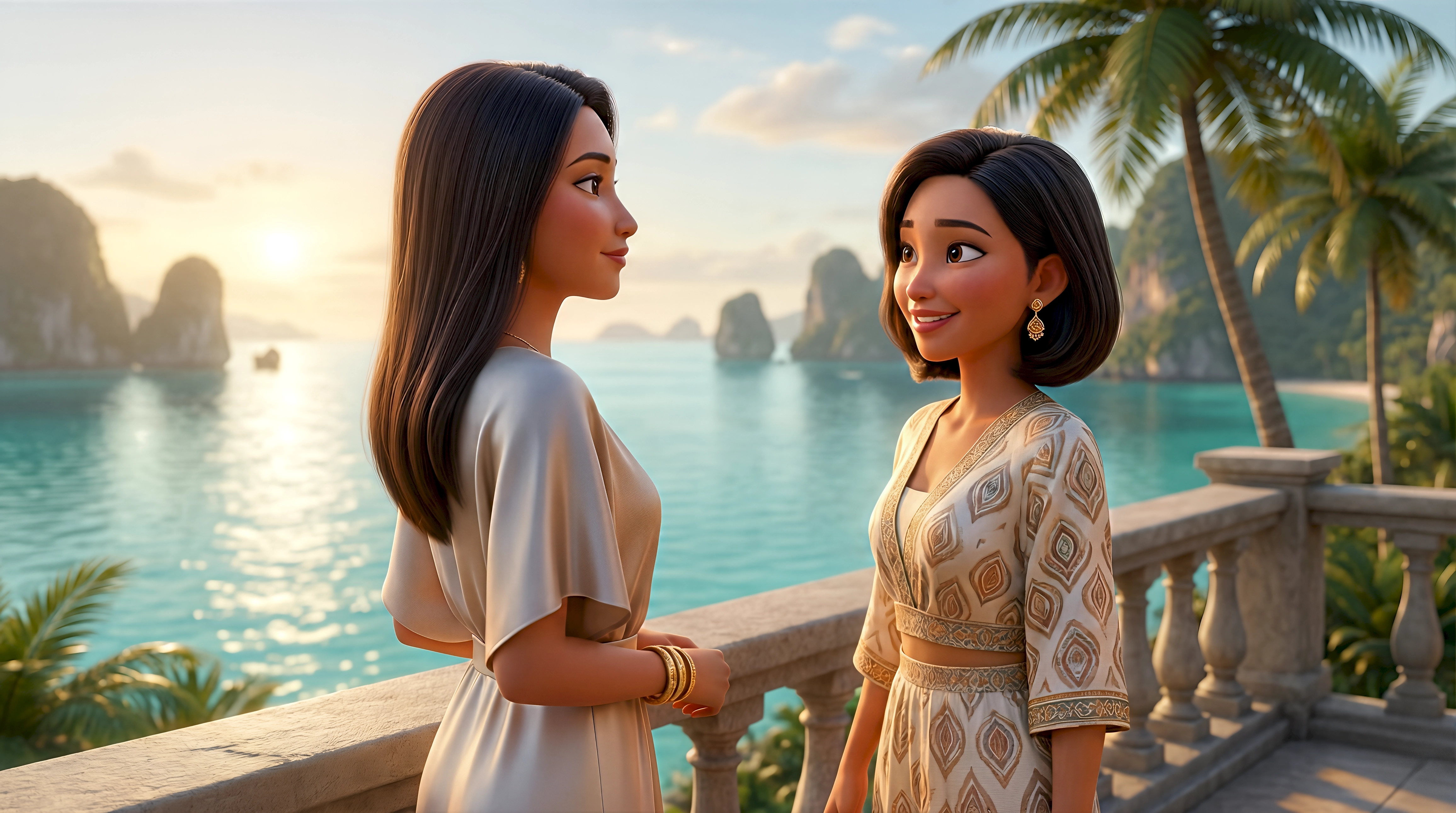 Two stylized 3D animated women in elegant flowing resort wear stand on a stone terrace overlooking the iconic limestone karst islands and turquoise waters of Ha Long Bay Vietnam at golden sunrise, part of HubPlanet's immersive virtual travel world 4K render.