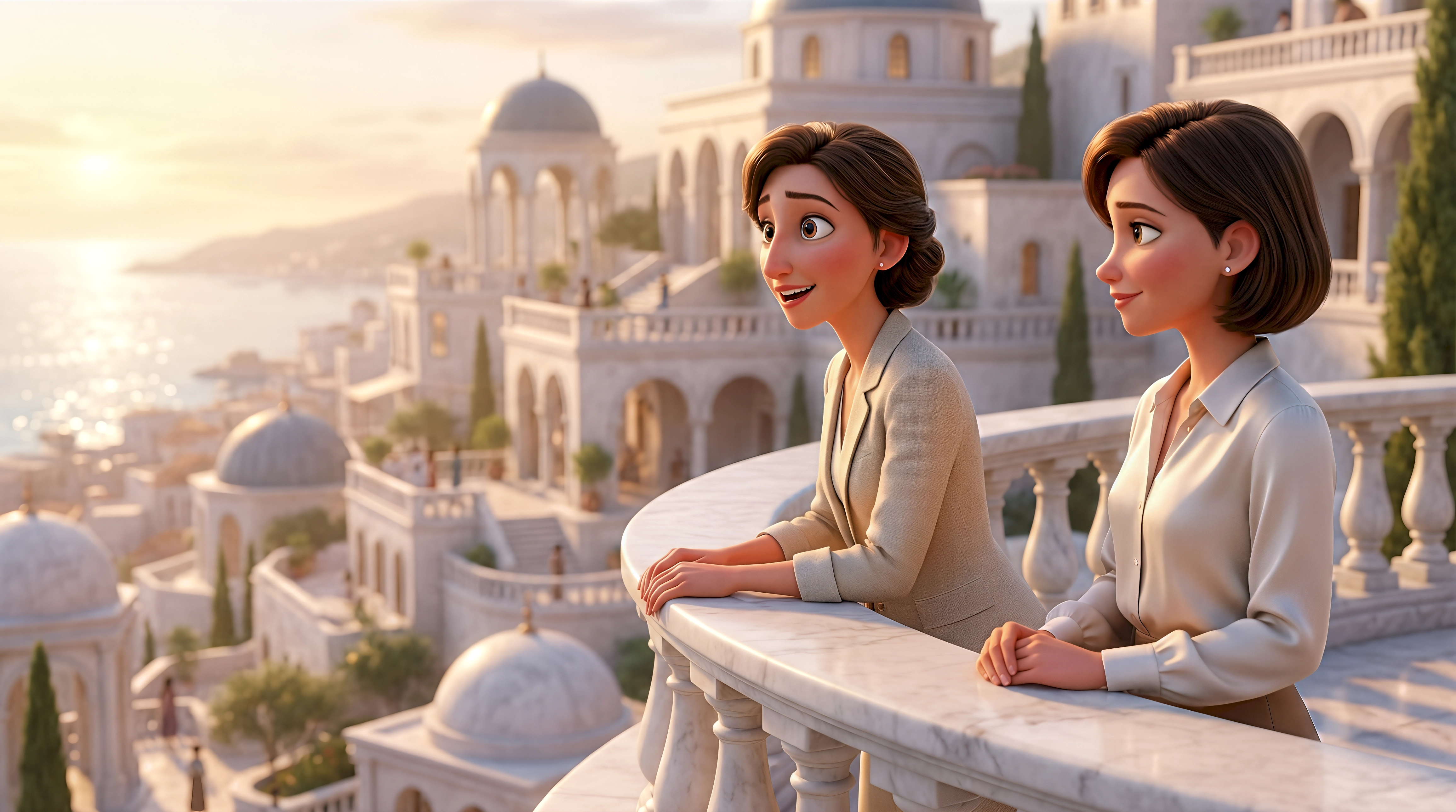 Two sophisticated 3D animated women in tailored blazers lean on a curved white marble terrace taking in a sweeping view of classical domed architecture cypress trees and the shimmering Bosphorus at golden sunset in Istanbul Turkey, part of HubPlanet's immersive 3D global travel metaverse 4K render.