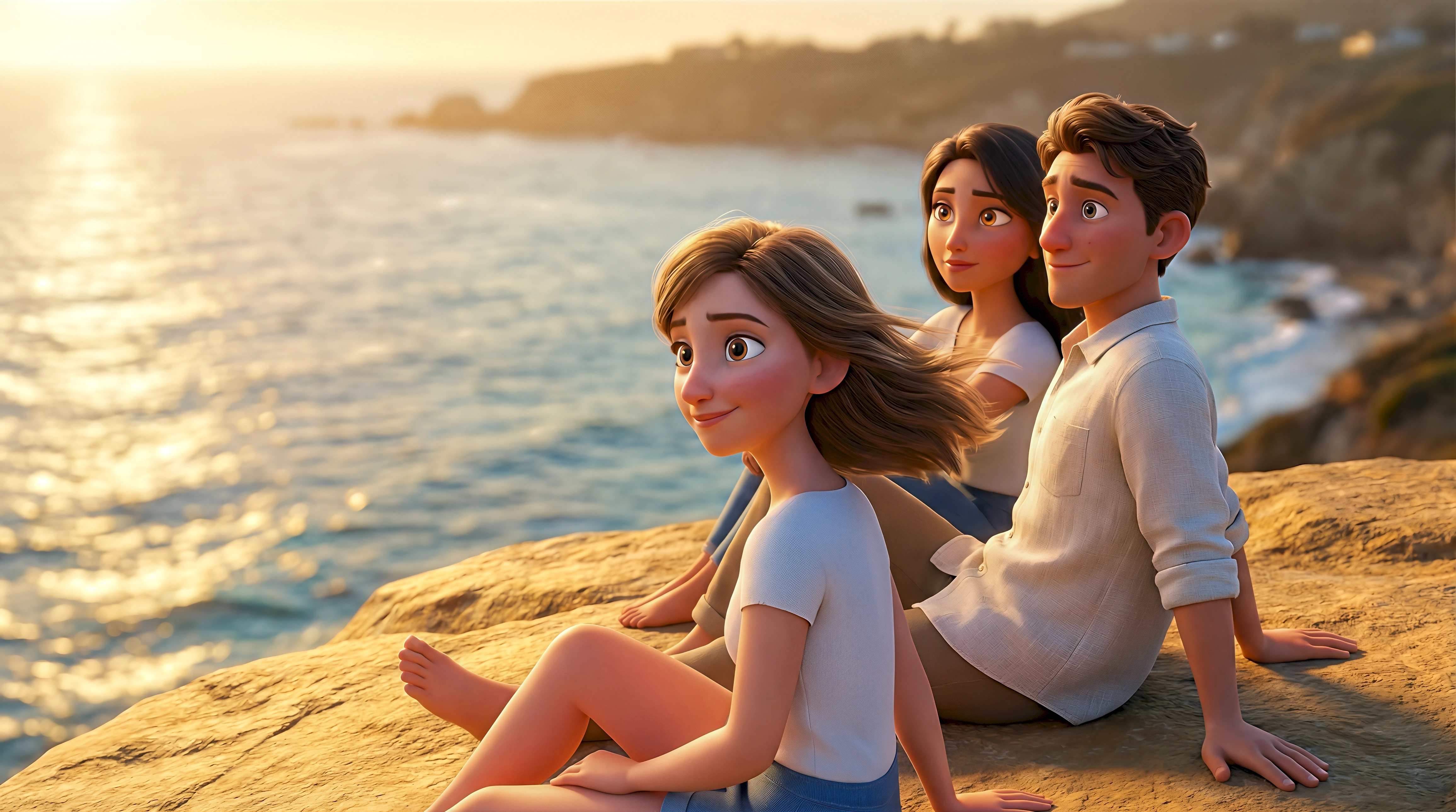 Three relaxed 3D animated characters in casual coastal wear sit on warm sandstone cliffs watching the golden Pacific sunset over the rocky coastline of Laguna Beach California, part of HubPlanet's best places to travel digital experience 4K render.