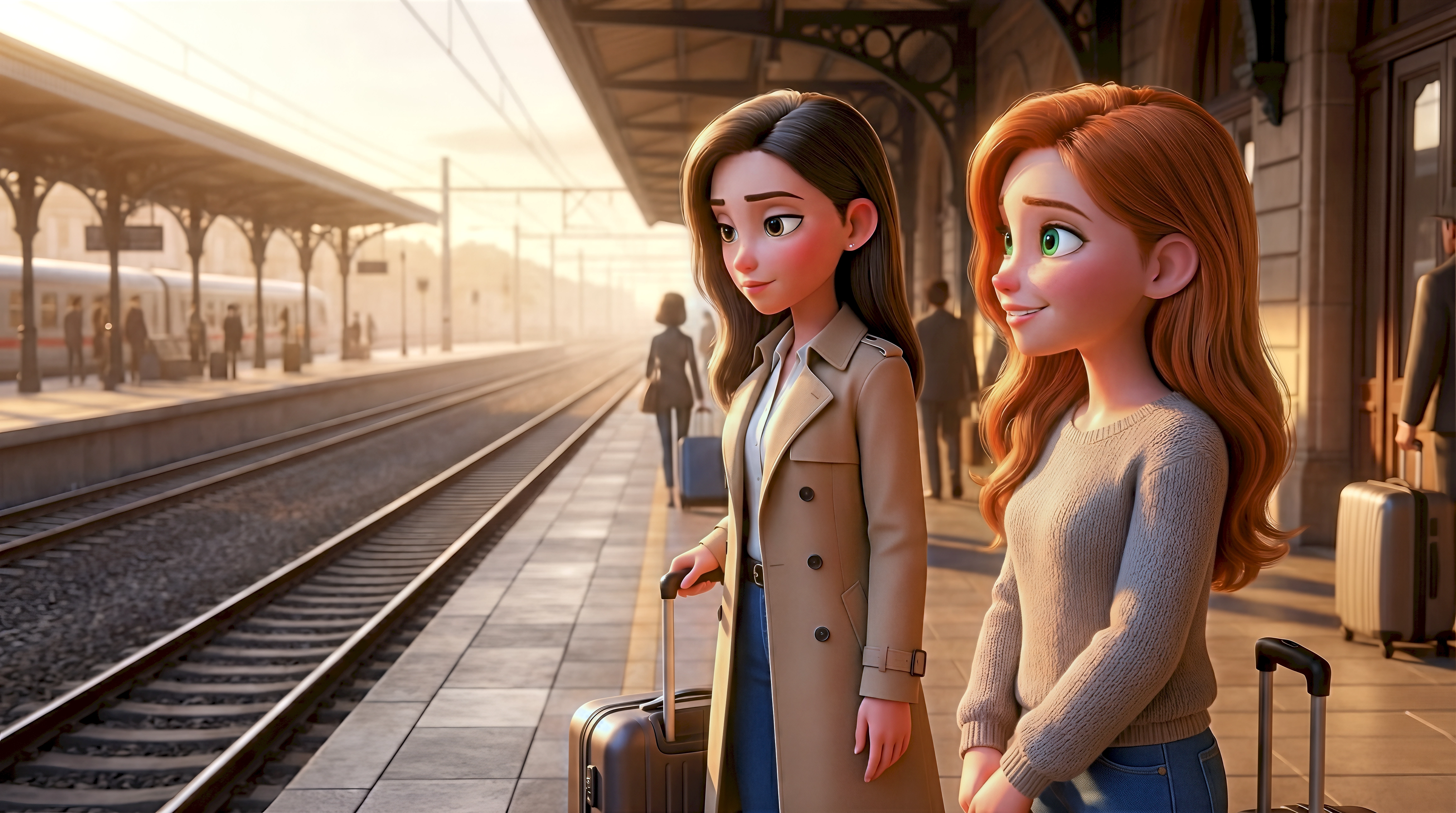Two stylized 3D animated women including one in a camel trench coat and one in a warm knit sweater both pulling rolling suitcases wait on the grand platform of Milano Centrale station in Italy as a sleek high-speed train arrives in golden morning light, part of HubPlanet's immersive 3D global travel metaverse 4K render.