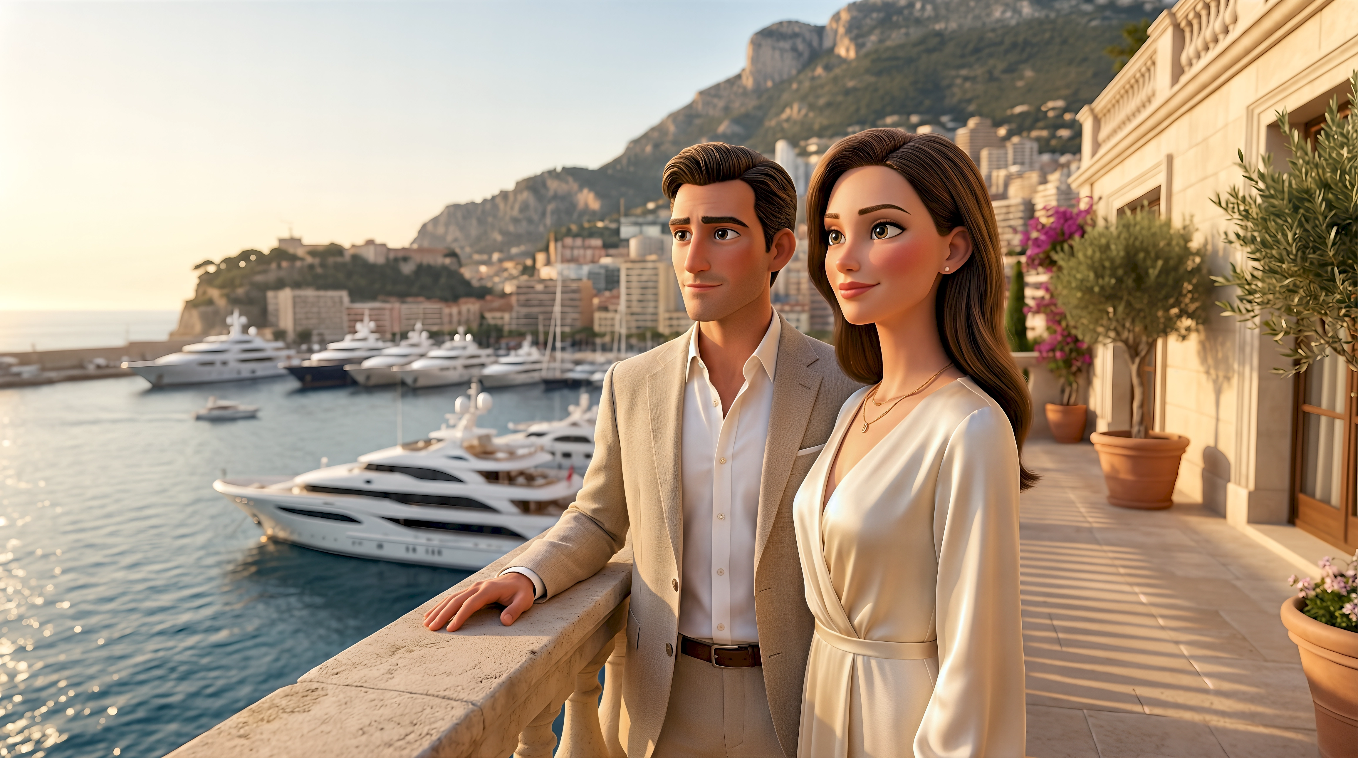 Two sophisticated 3D animated characters in a linen suit and silk wrap dress stand on a classical limestone terrace overlooking Port Hercule harbour packed with superyachts and the iconic cliff-top skyline of Monaco in the French Riviera, part of HubPlanet's AI travel planner virtual world 4K render.