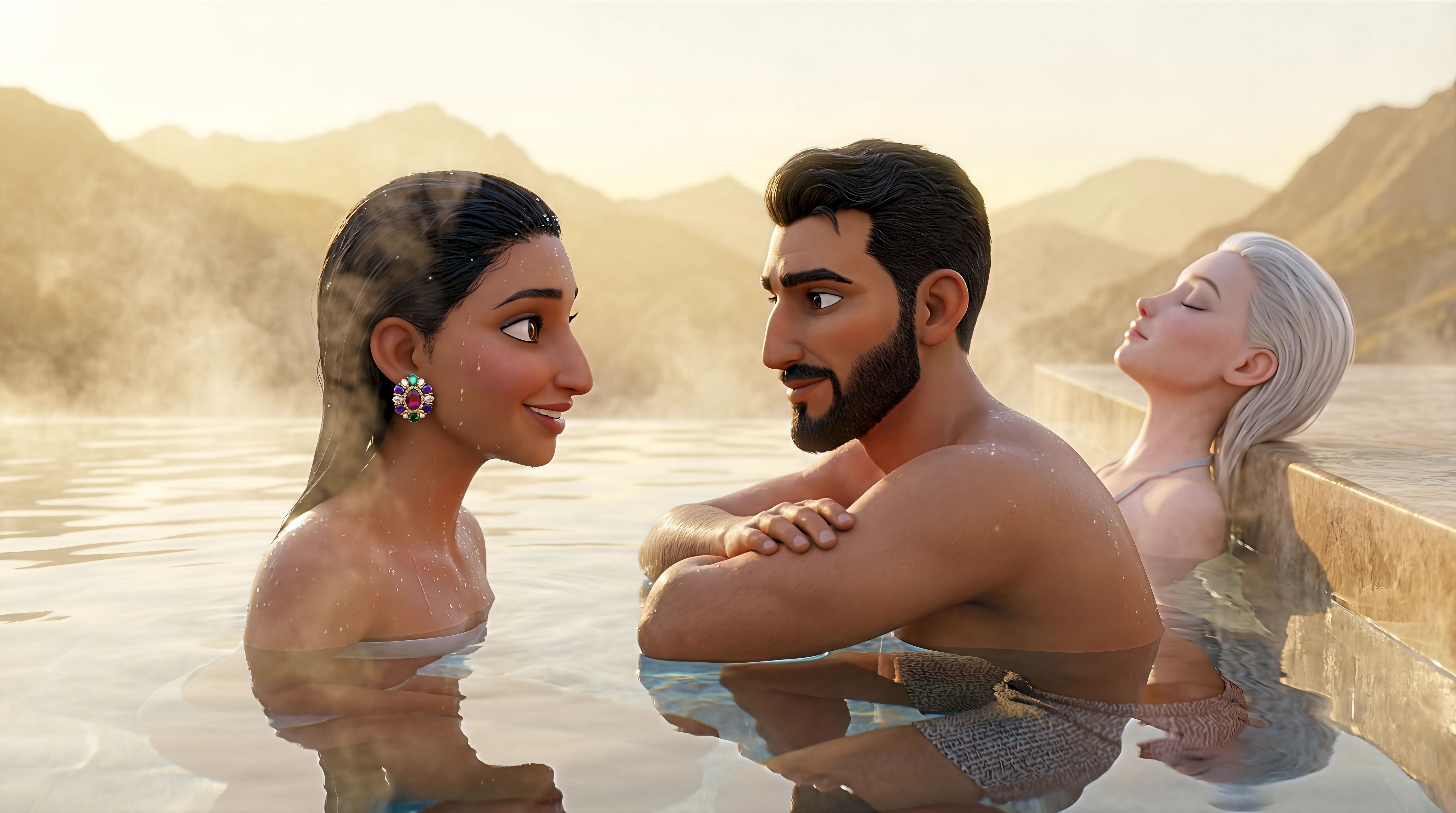 Three serene 3D animated characters including a woman with a jewelled earring a bearded man and a platinum-haired woman soak in a steaming natural thermal pool surrounded by bare golden mountain ridges in the hot springs of Oman, part of HubPlanet's digital twin tourism platform 4K render.
