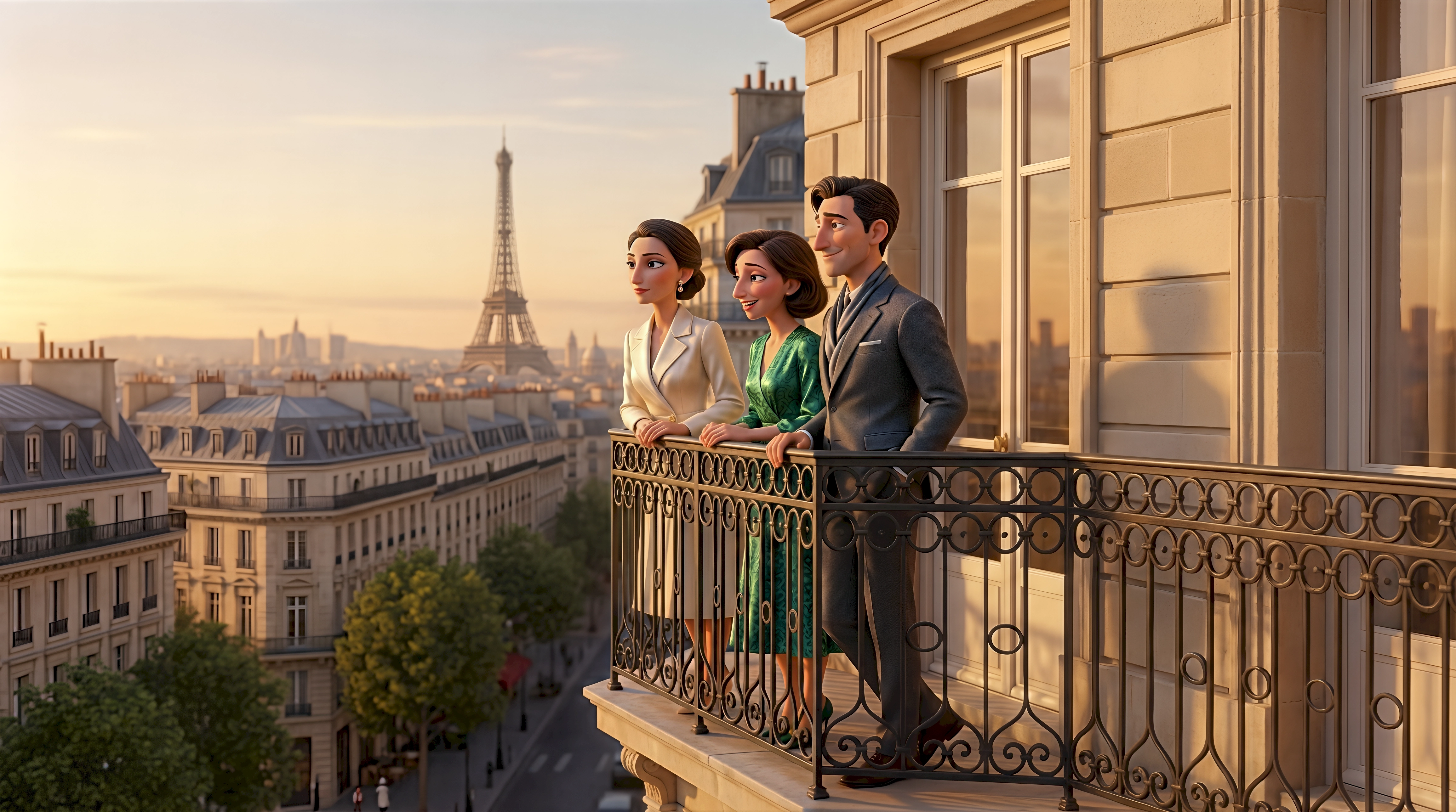 Three elegant 3D animated characters including two women in a cream blazer and green dress and a man in a charcoal suit stand on a classic wrought iron Haussmann balcony overlooking the Eiffel Tower and golden Parisian rooftops at sunset in Paris France, part of HubPlanet's photorealistic digital destination experience 4K render.