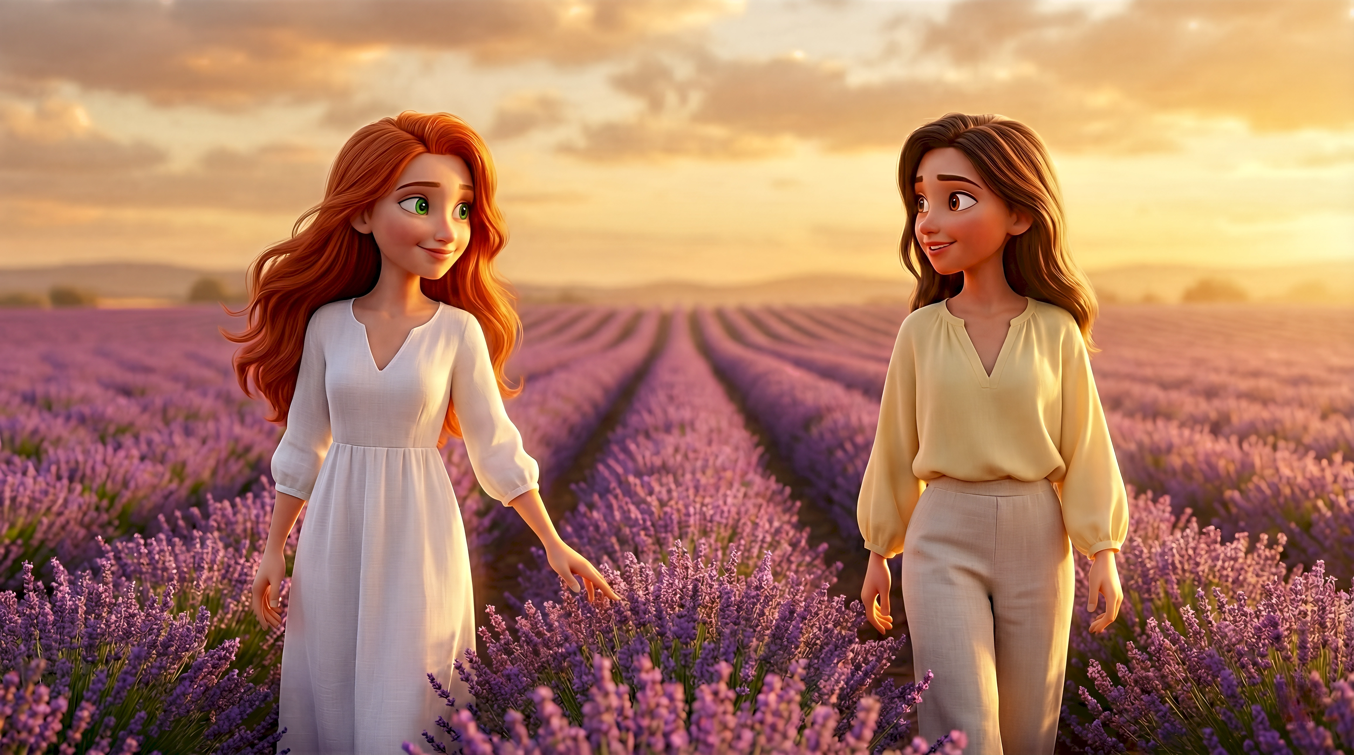 Two radiant 3D animated women in a white linen dress and yellow blouse walk through endless rows of blooming lavender on the Valensole Plateau in Provence France bathed in rich golden sunset light, part of HubPlanet's immersive virtual travel world 4K render.