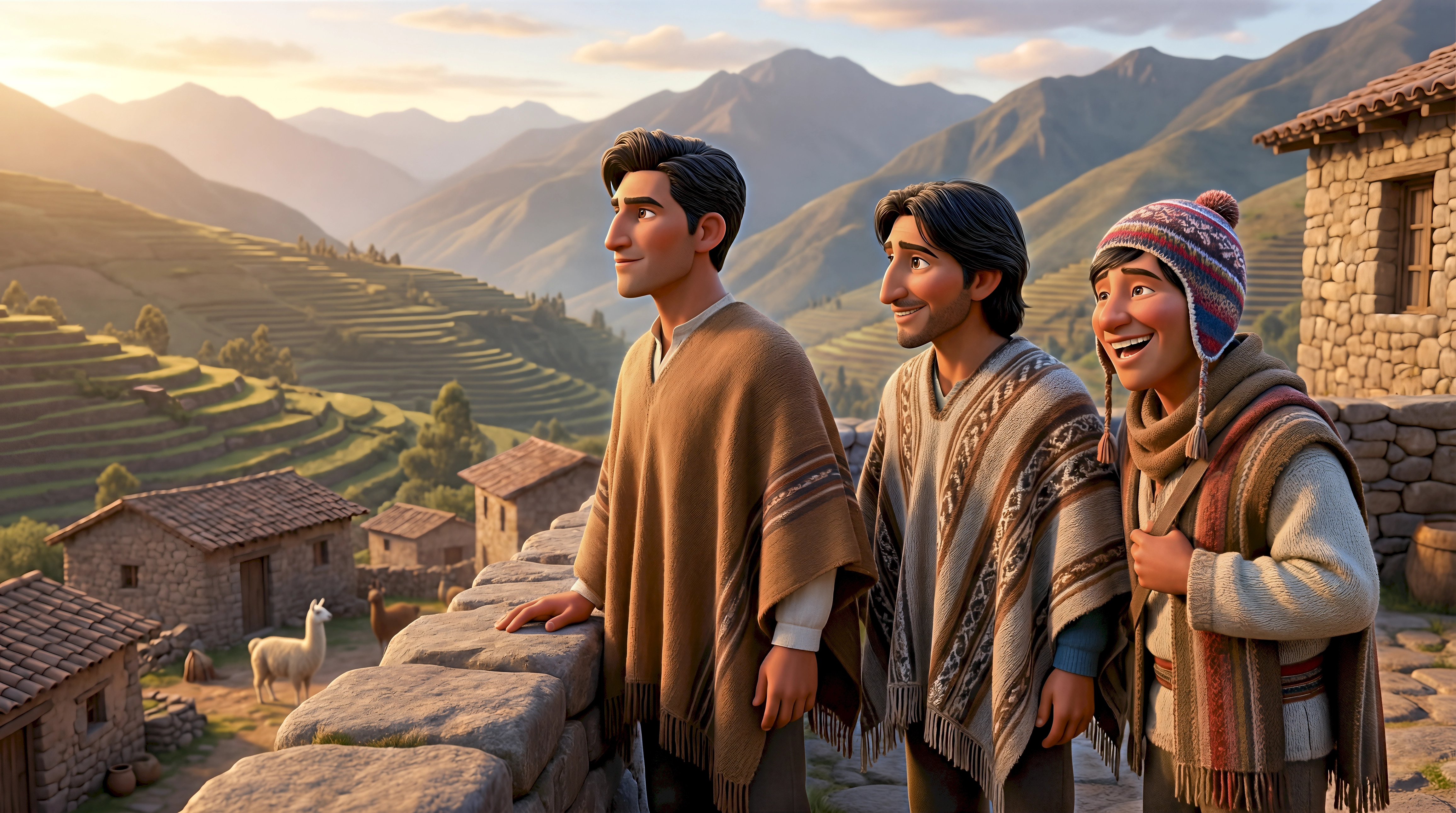 Three cinematic 3D animated characters in traditional Andean wool ponchos and a chullo beanie stand on an ancient stone wall overlooking sweeping Inca agricultural terraces a highland village and a llama in the Sacred Valley of Peru at golden sunset, part of HubPlanet's immersive 3D global travel metaverse 4K render.
