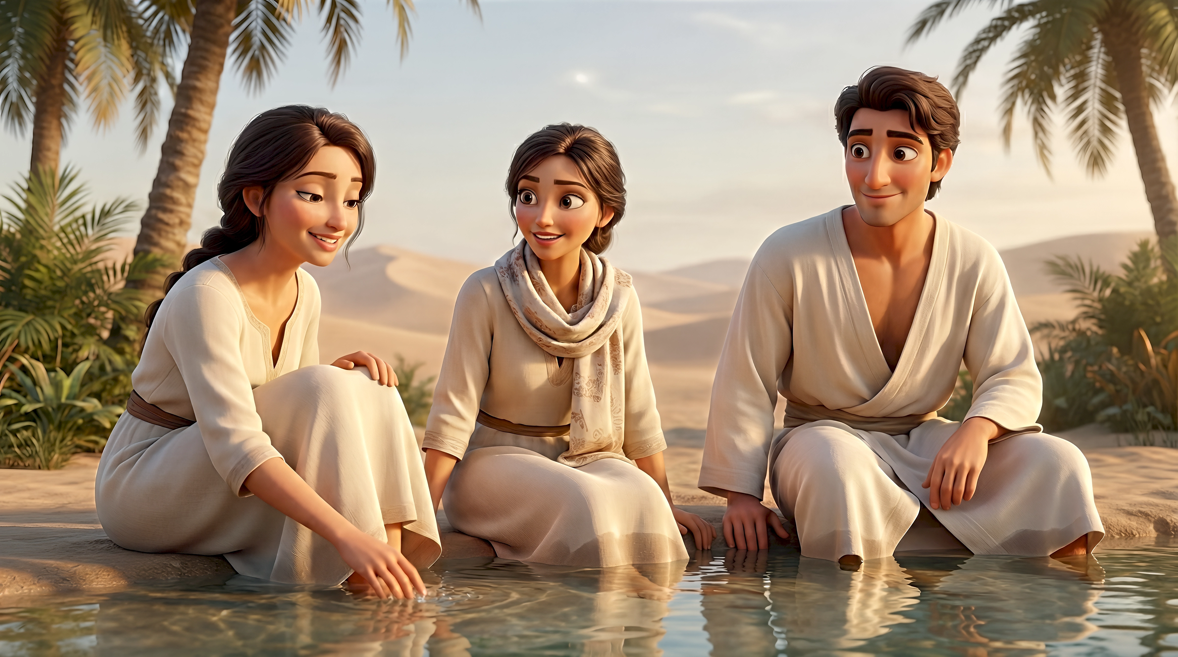 Three expressive 3D animated characters including two women and a man dressed in flowing cream linen robes sit barefoot at the edge of a tranquil oasis pool surrounded by date palms and sweeping Sahara sand dunes in Merzouga Morocco, part of HubPlanet's digital twin tourism platform 4K render.