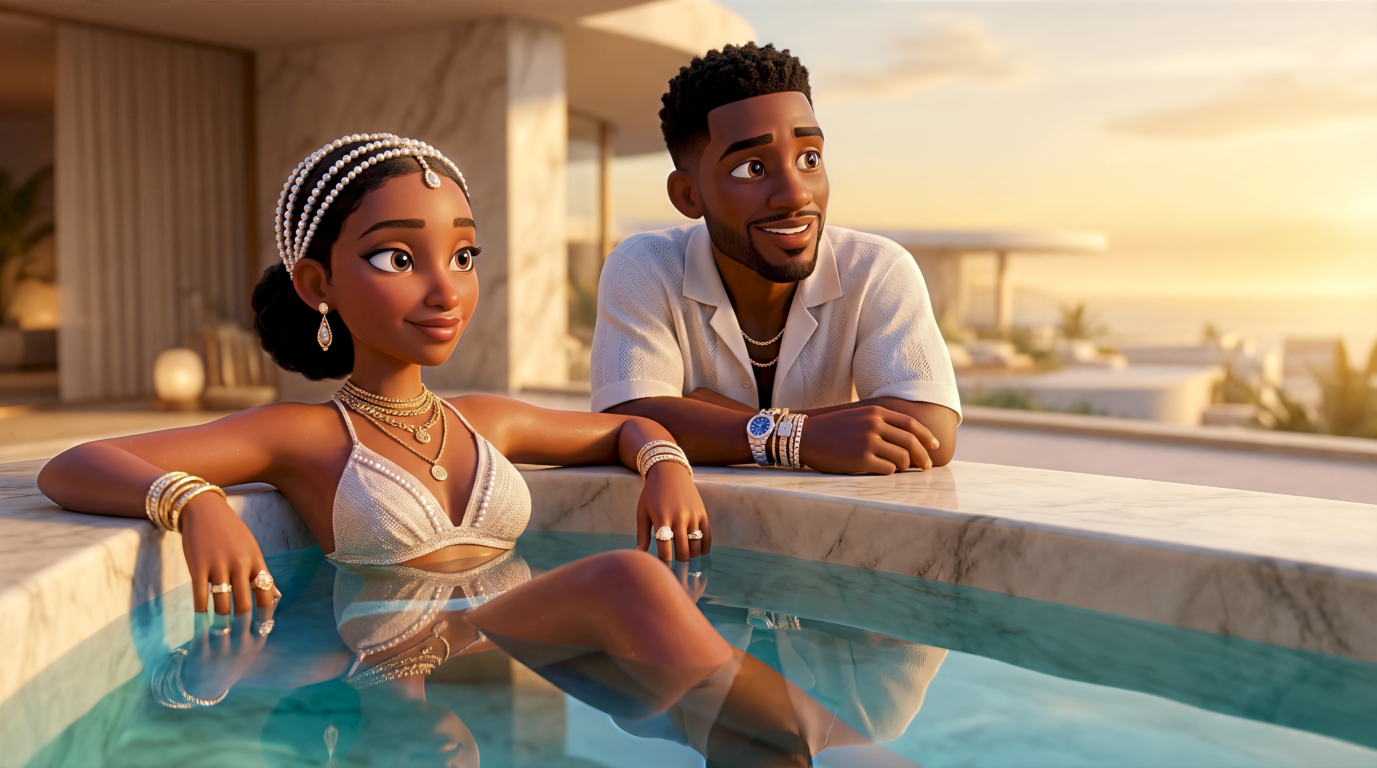 Two glamorous 3D animated characters draped in gold jewellery and luxury accessories relax at the edge of a white marble infinity pool overlooking the golden Aegean sunset and whitewashed clifftop architecture of Santorini Greece, part of HubPlanet's cinematic open world travel simulation 4K render.