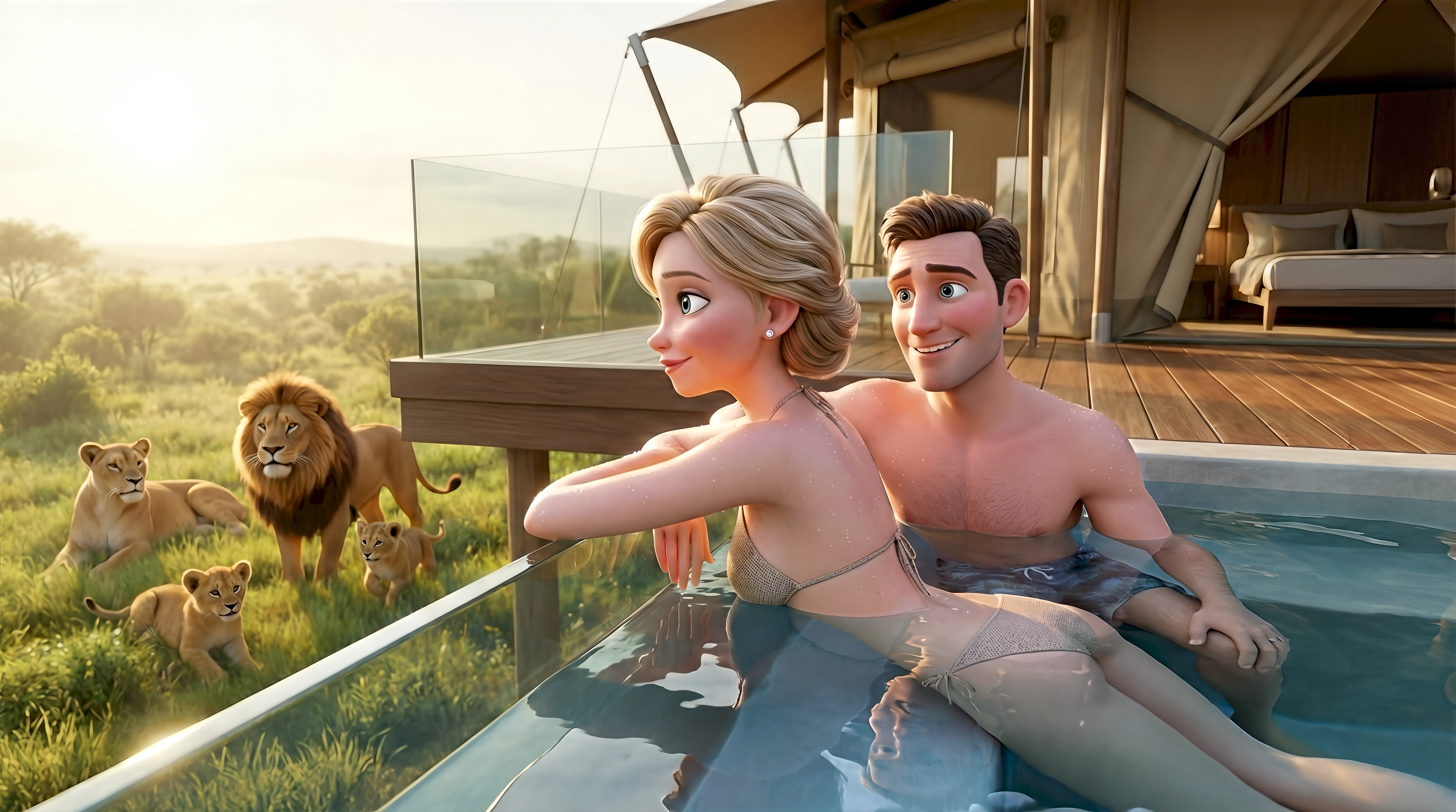Two stylized 3D animated characters including a woman in a halter bikini and a shirtless man in swim shorts relax in a private plunge pool on a luxury safari tent deck in the Serengeti Tanzania, watching a lion pride with cubs roam the golden savanna at sunrise, part of HubPlanet's high-fidelity virtual world travel experience 4K render.