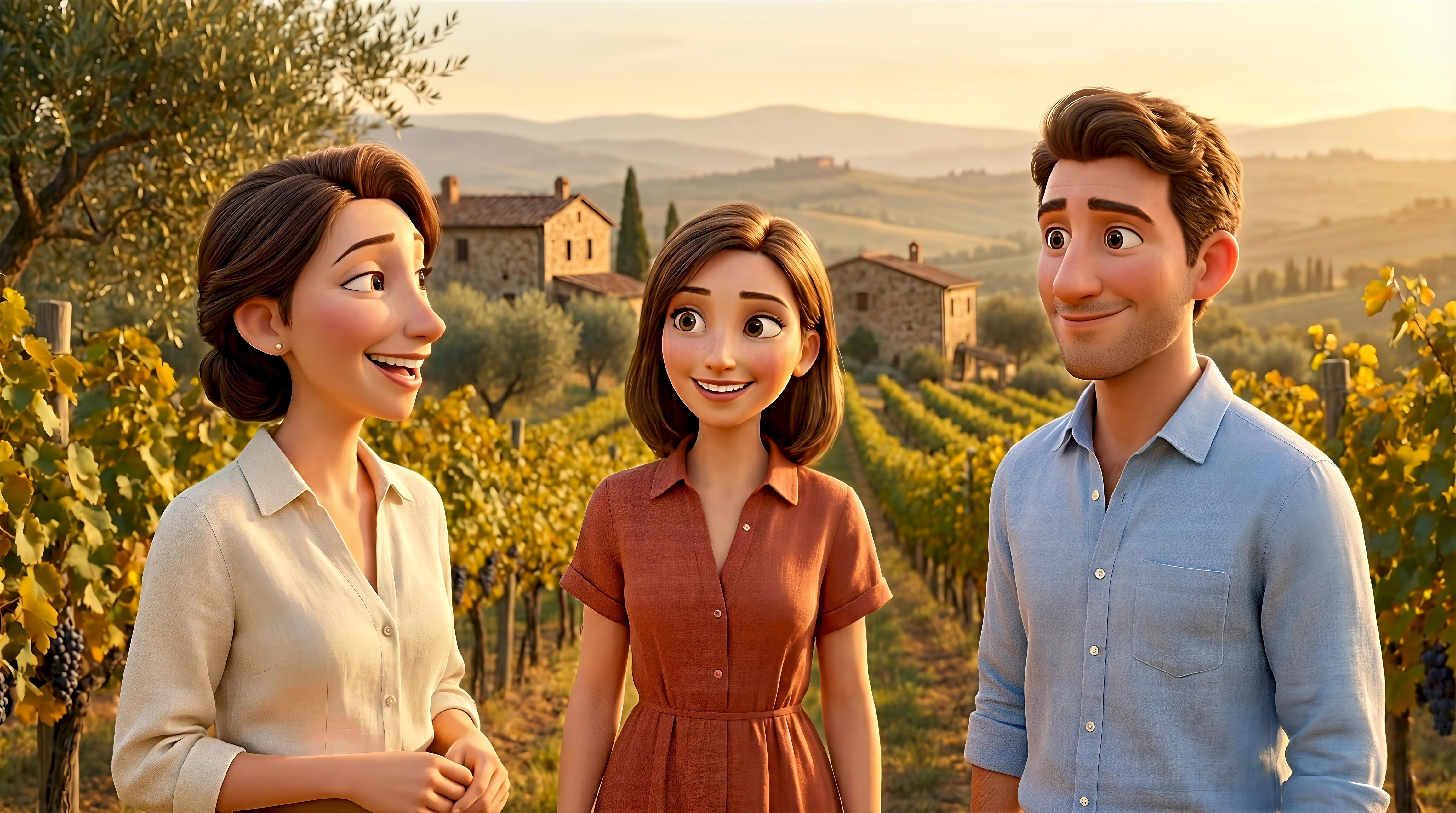 Three expressive 3D animated characters in linen and a terracotta dress stand among ripe grape vines at a golden hour Tuscan vineyard with ancient stone farmhouses cypress trees and rolling hills in the wine country of Tuscany Italy, part of HubPlanet's cinematic open world travel simulation 4K render.